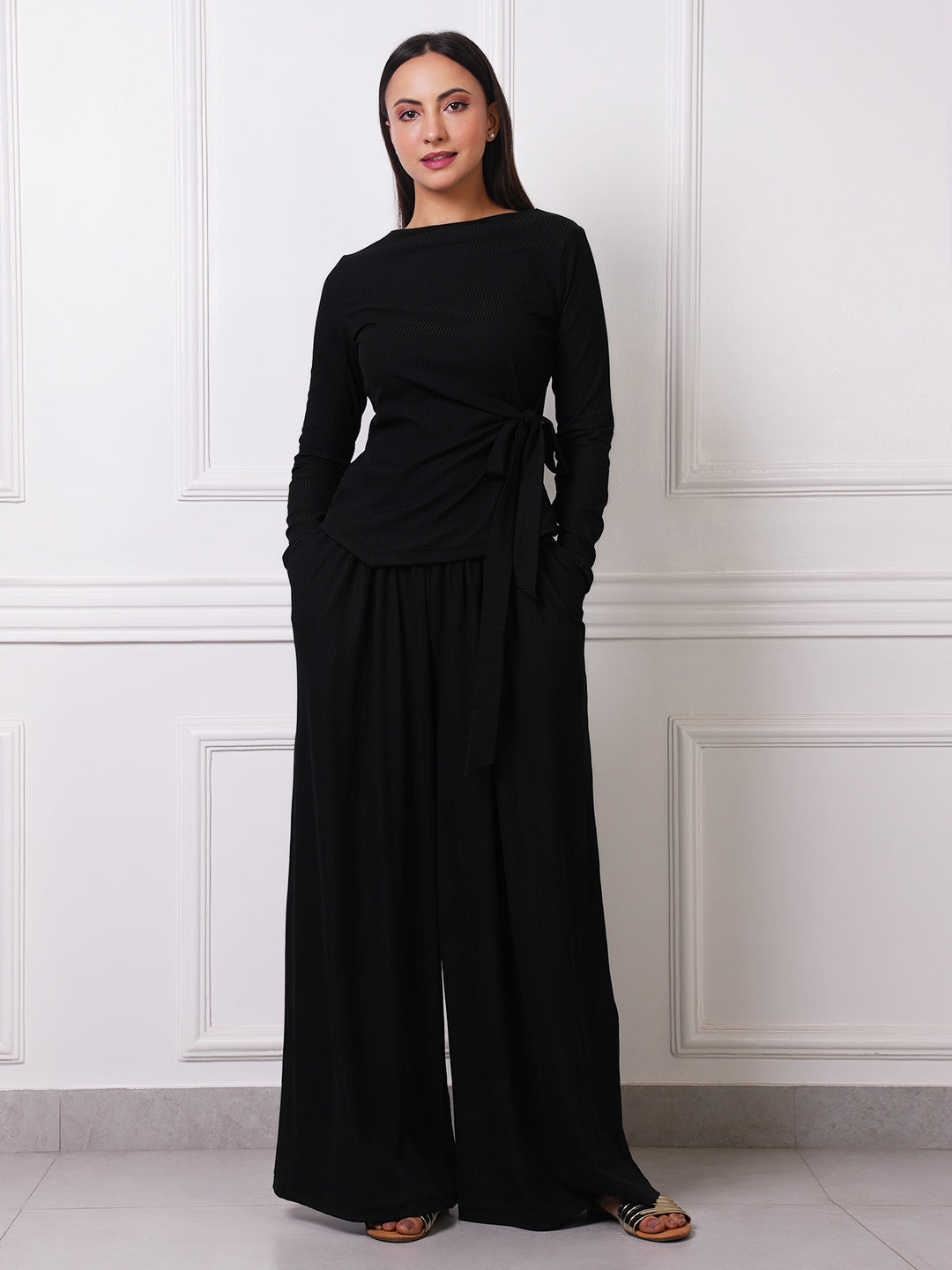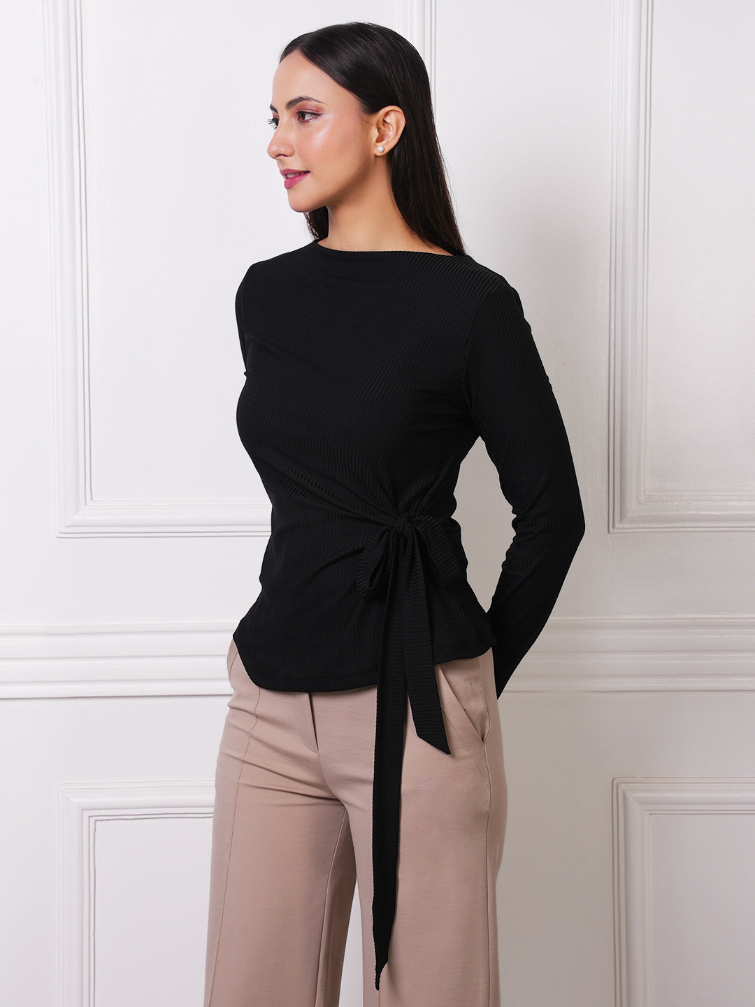 Black Ribbed Boat Neck Tie-Waist Top