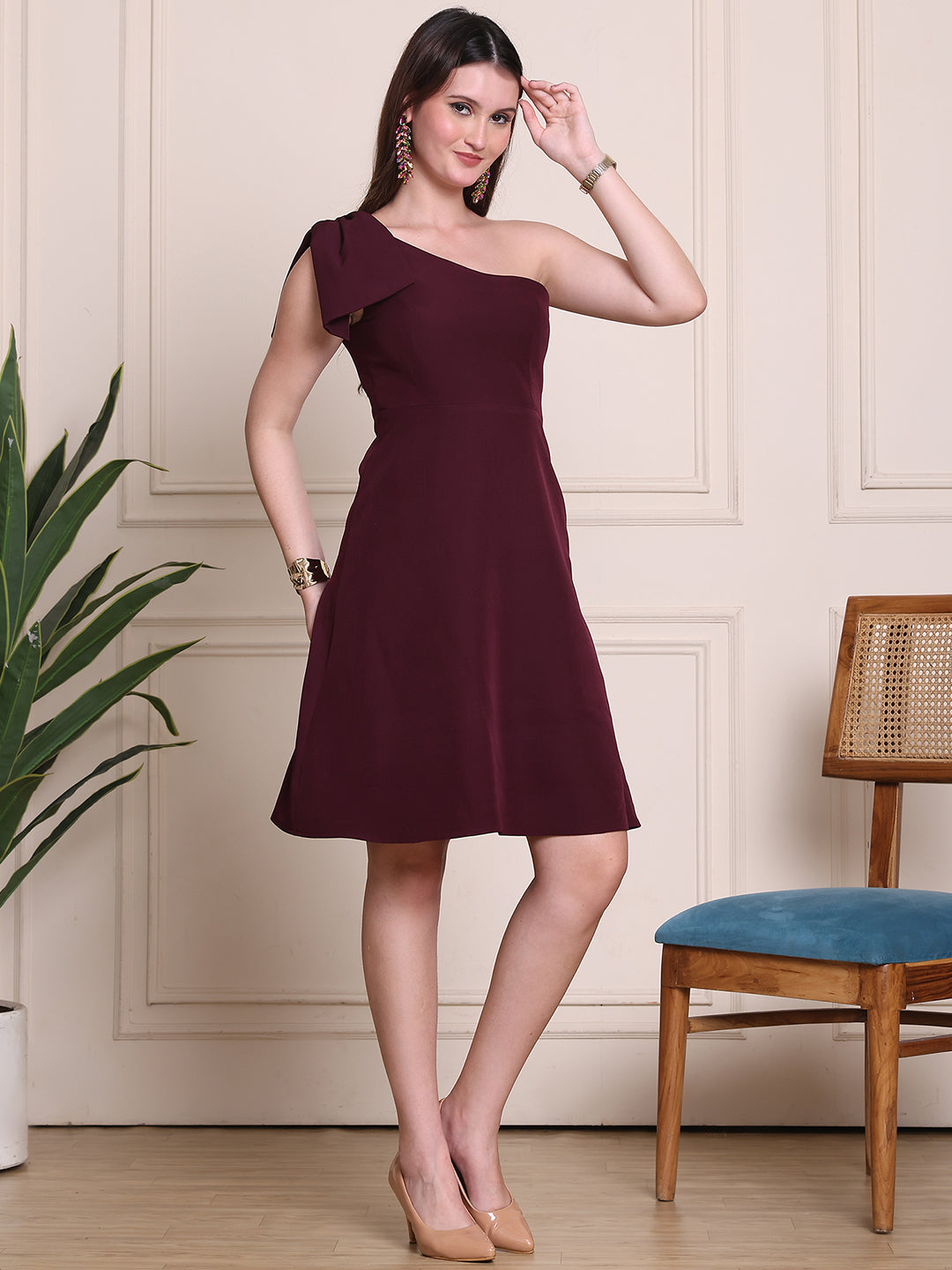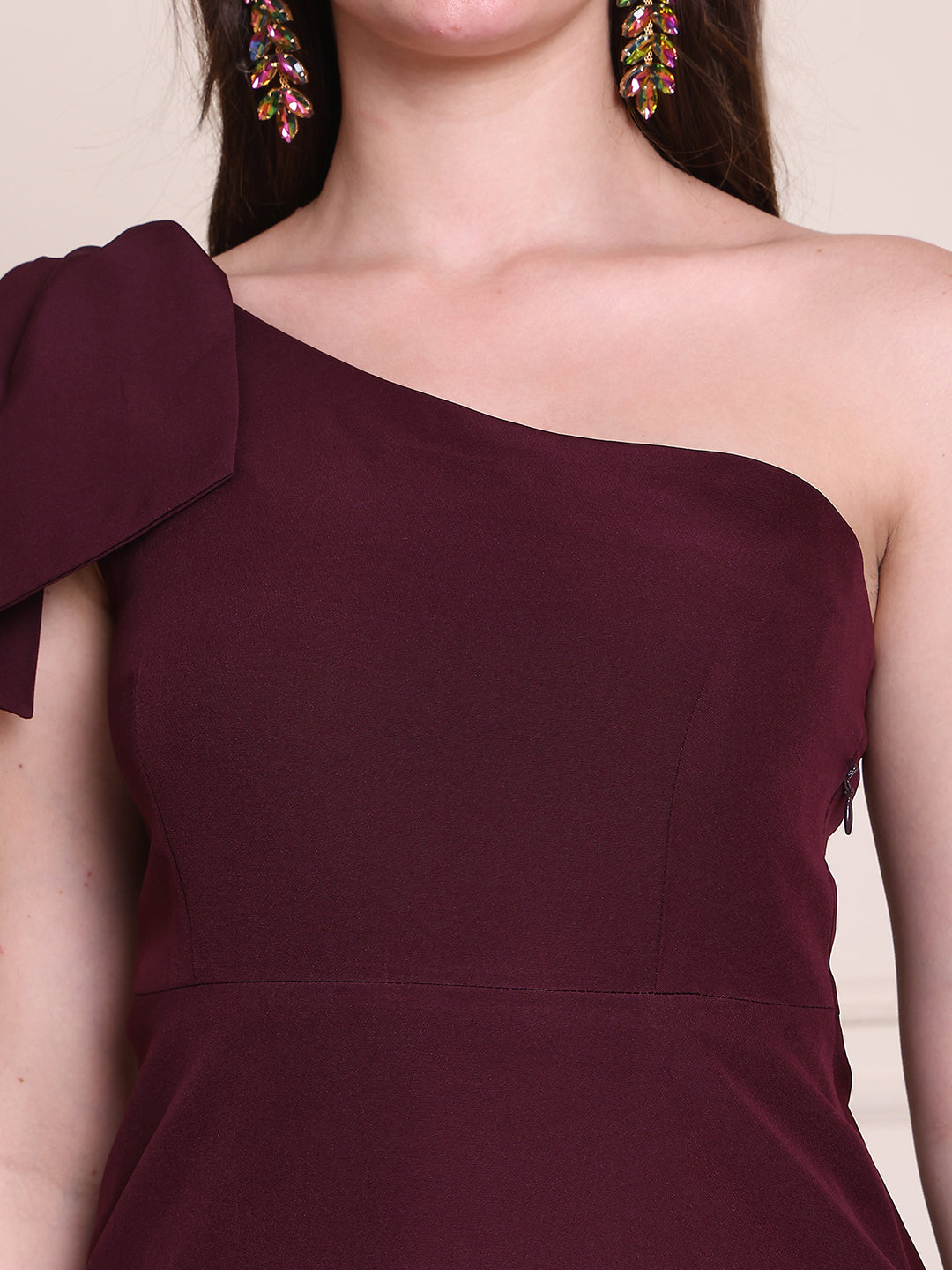 This elegant A-line dress in rich wine features a chic one-shoulder design, complemented by a delicate shoulder bow for an added touch of sophistication. The perfect balance of style and grace, this dress exudes timeless elegance for any occasion