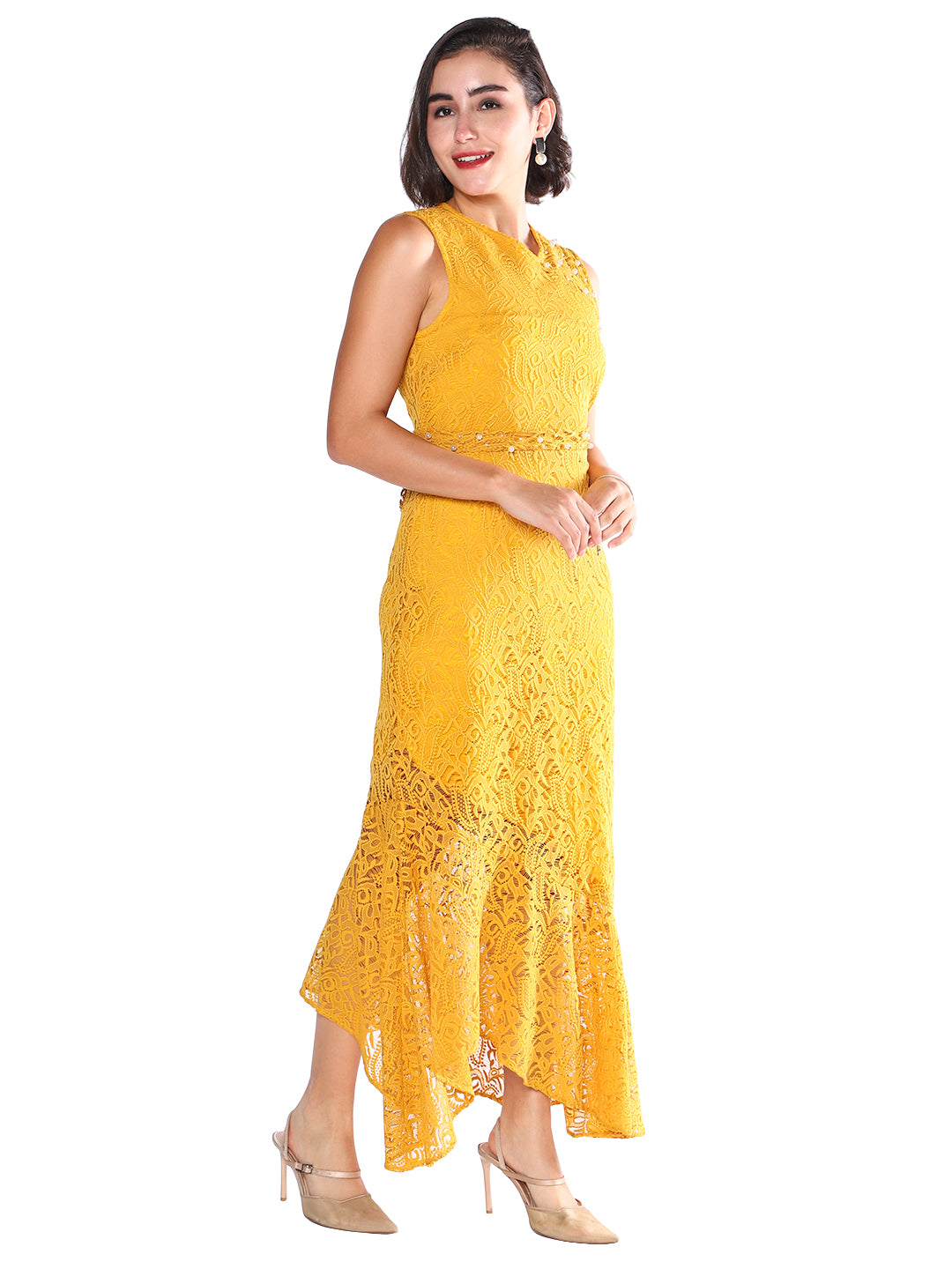 Crafted from premium Marigold Yellow Poly Lace, the intricate floral pattern provides beautiful texture and sophisticated visual depth. The classic sleeveless silhouette and fitted waist keep the look refined.
