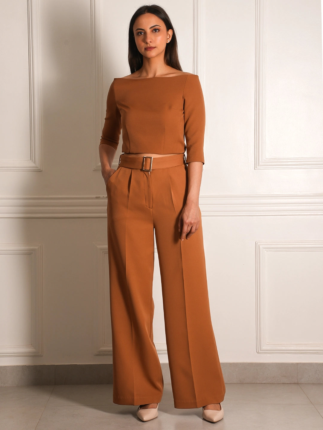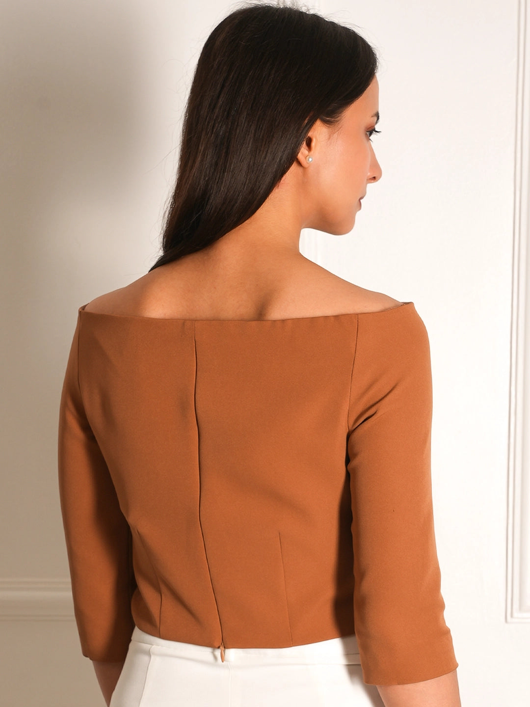 Rust brown structured top Elegant Bardot neckline Three-quarter sleeves Minimal tailored seams for a flattering silhouette Clean and modern design perfect for versatile styling