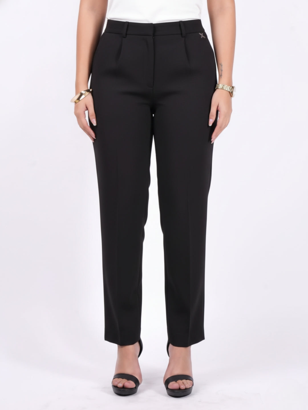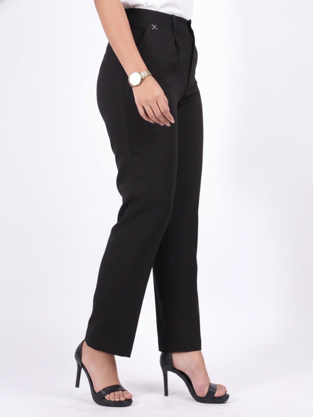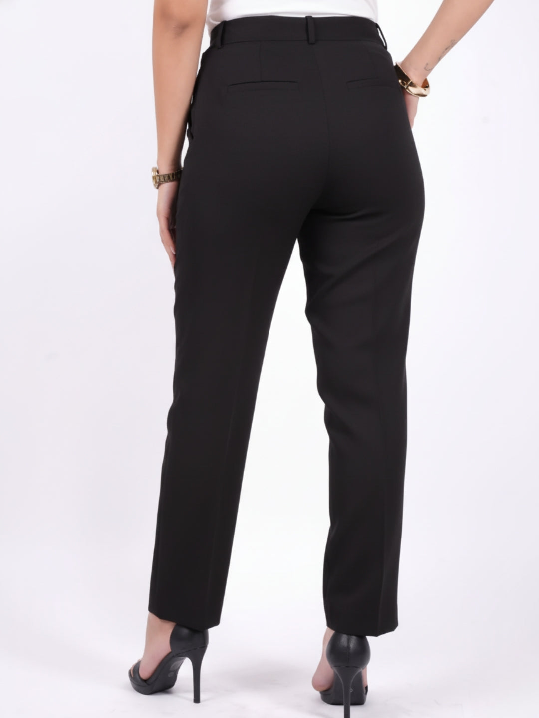 High waist, flat front, pressed creases, streamlined leg with a neat ankle finish, and subtle pockets.
