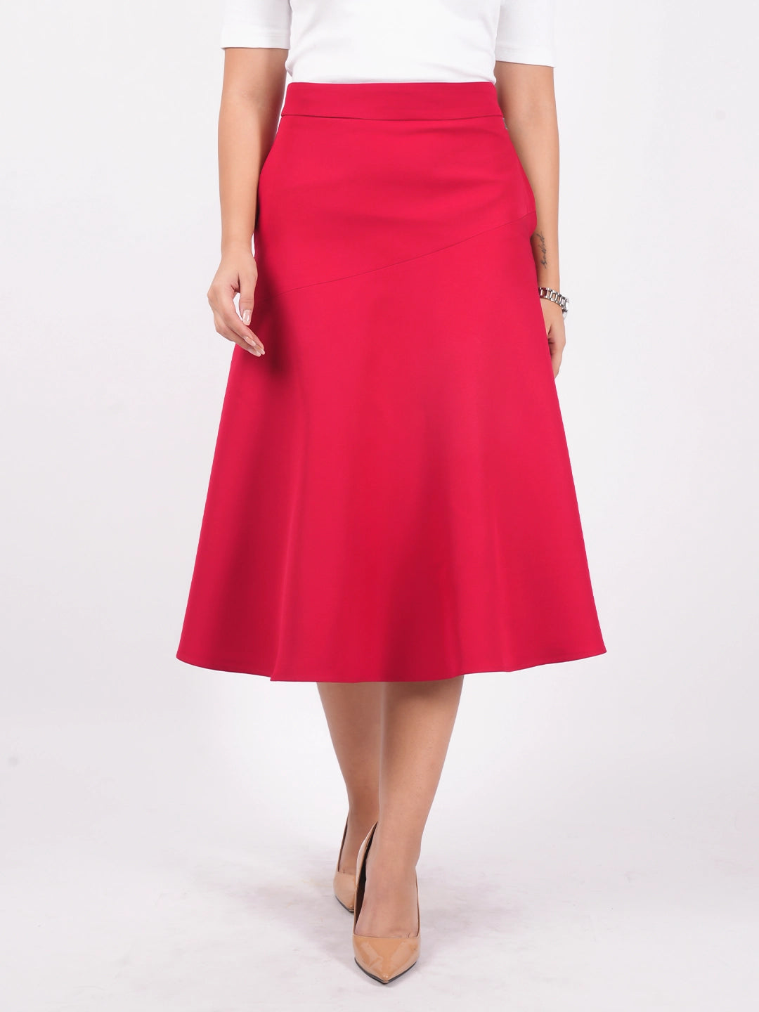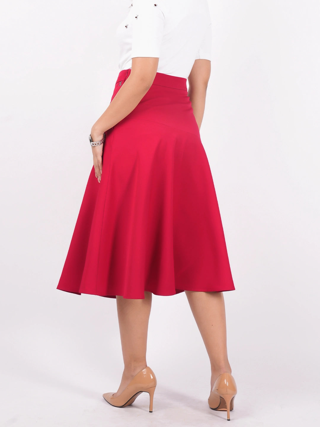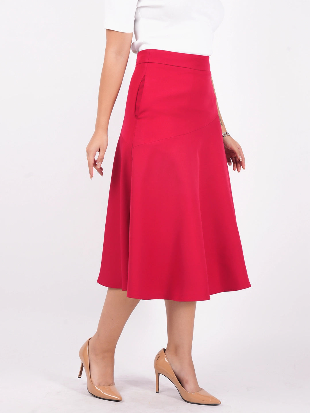 Full flared shape, mid-calf length, side pockets, and sleek waistband for instant polish.