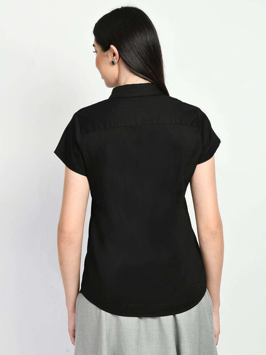 A classic black shirt made from premiem cotton fabric that is soft and breathable. The shirt has collar neck, cap sleeves and a button up front. The colour may vary slightly according to device settings.
