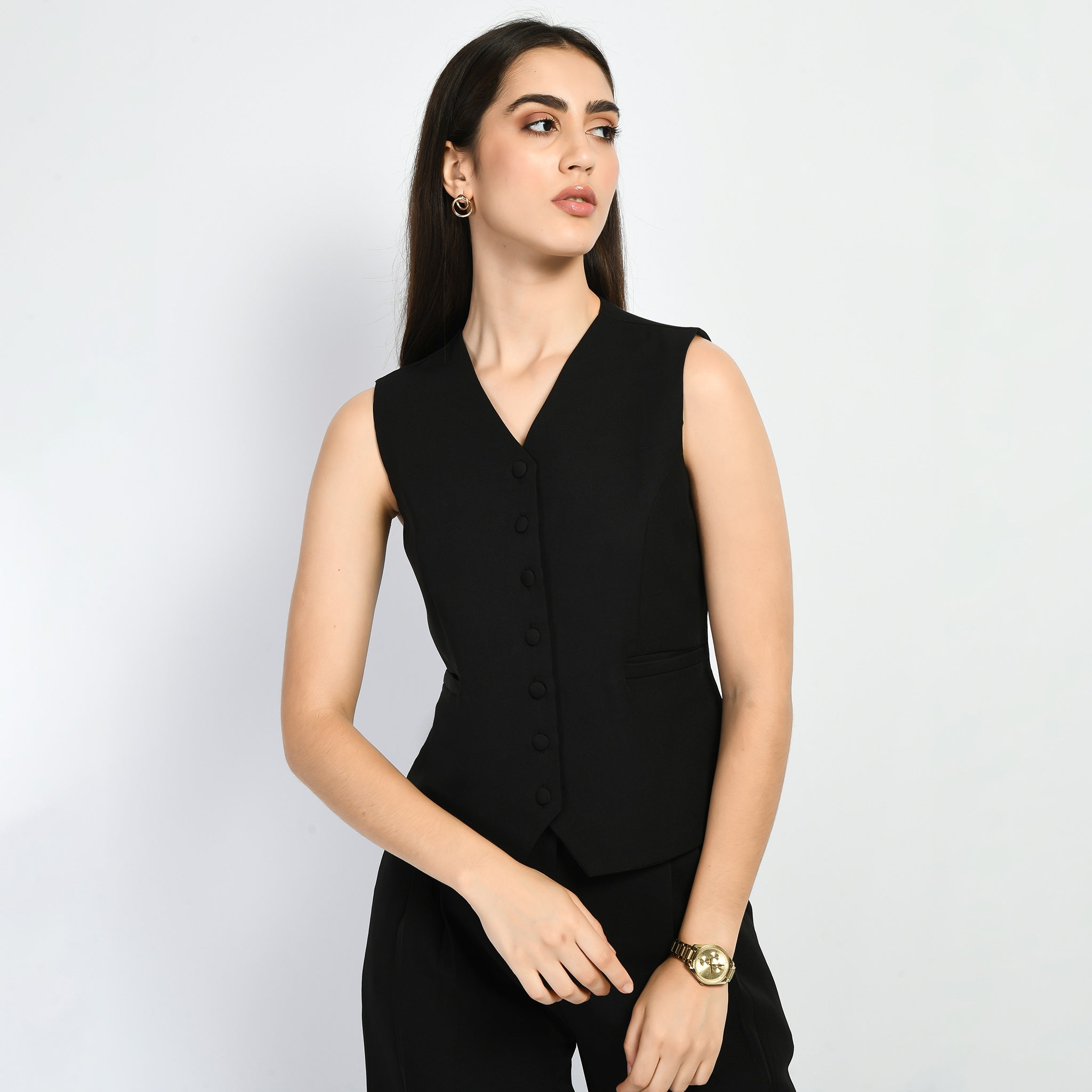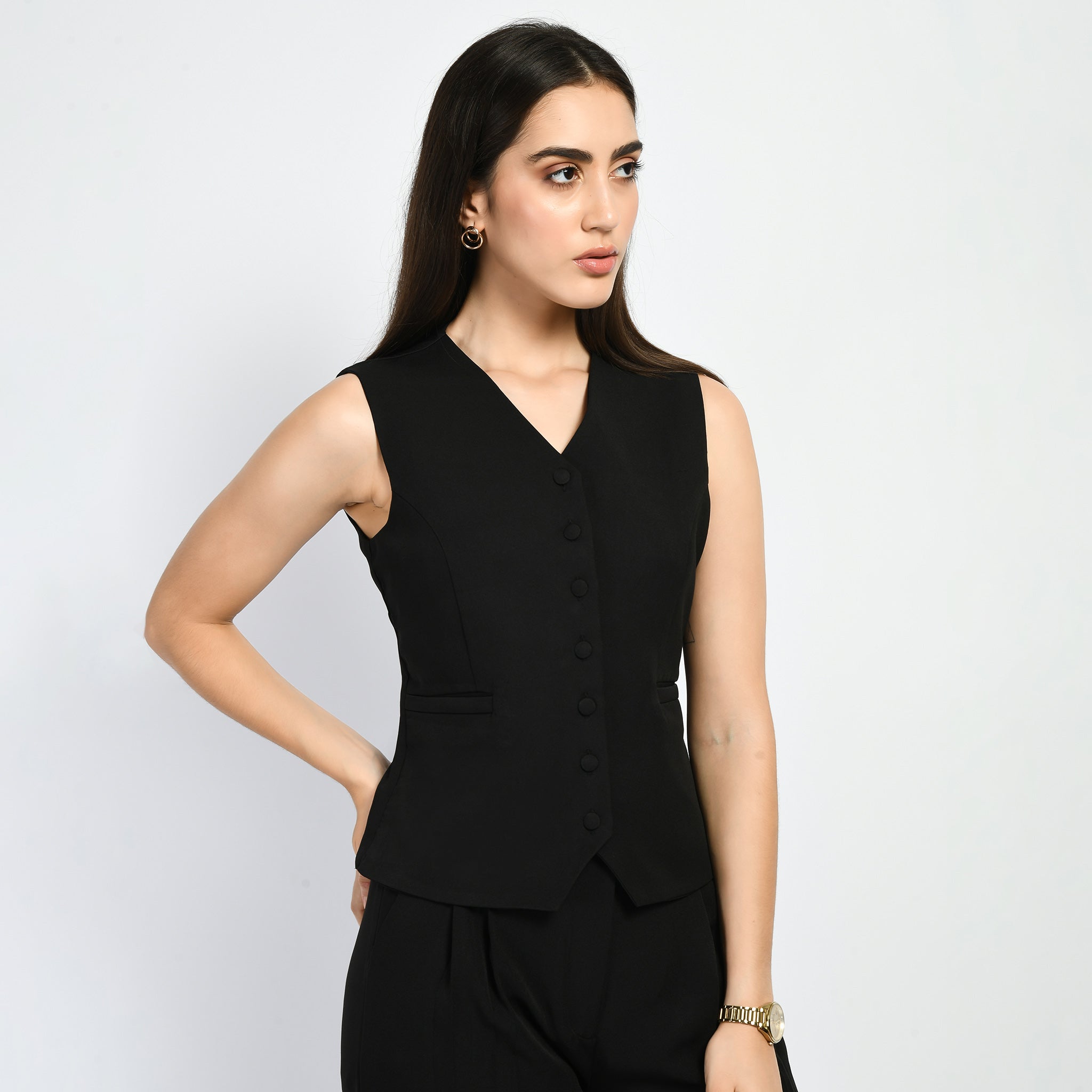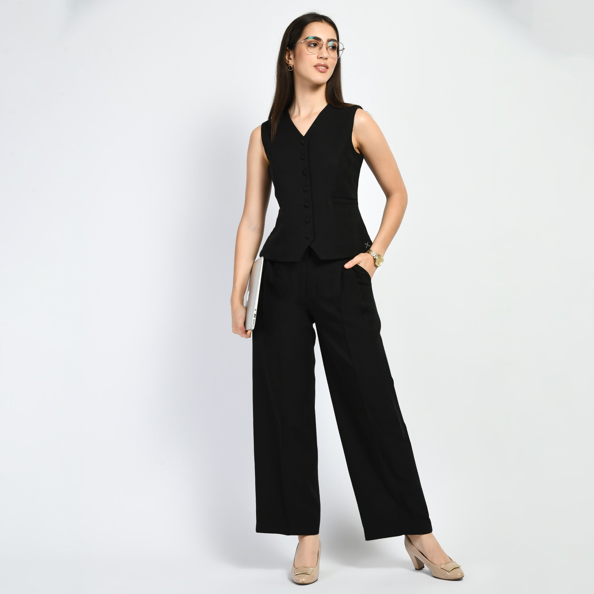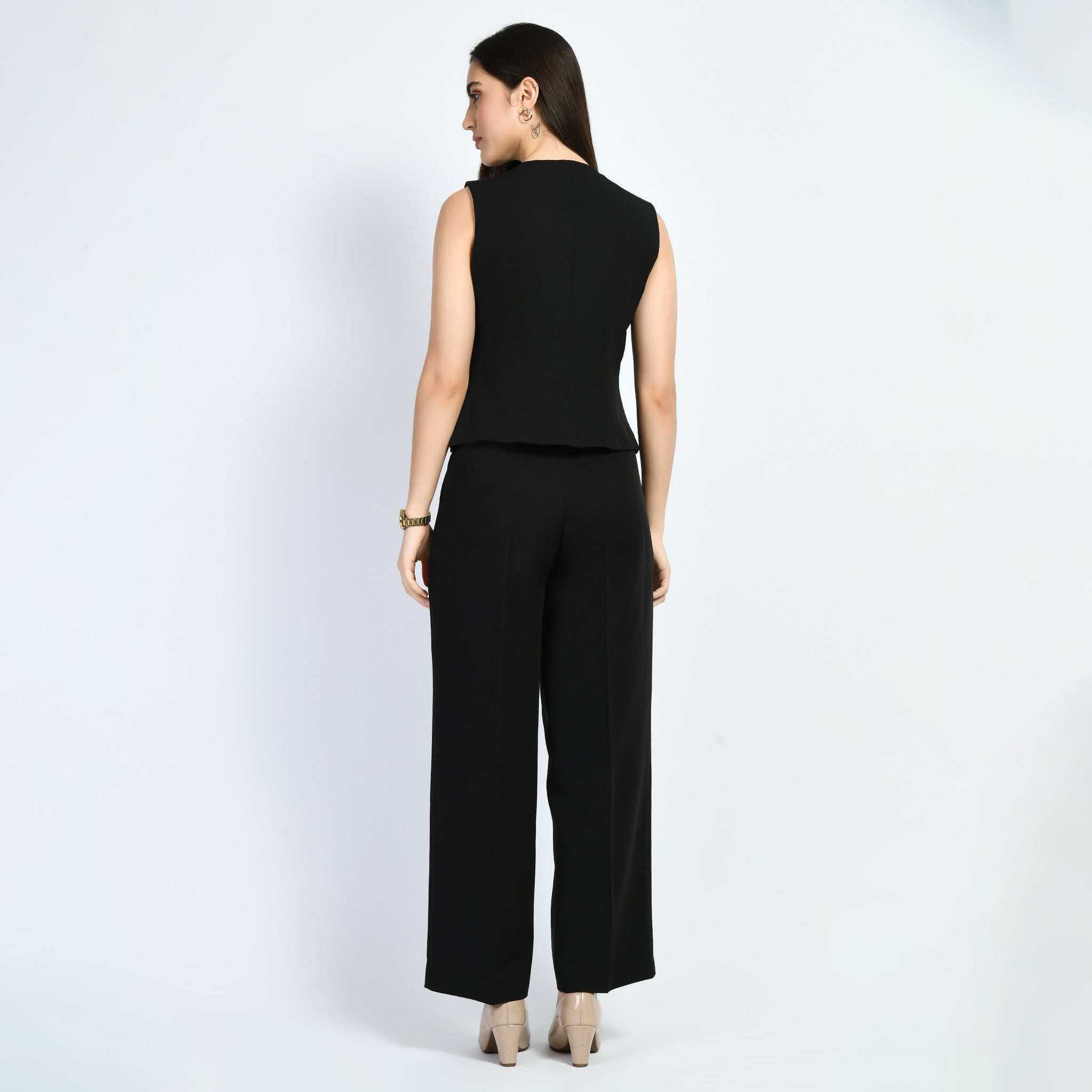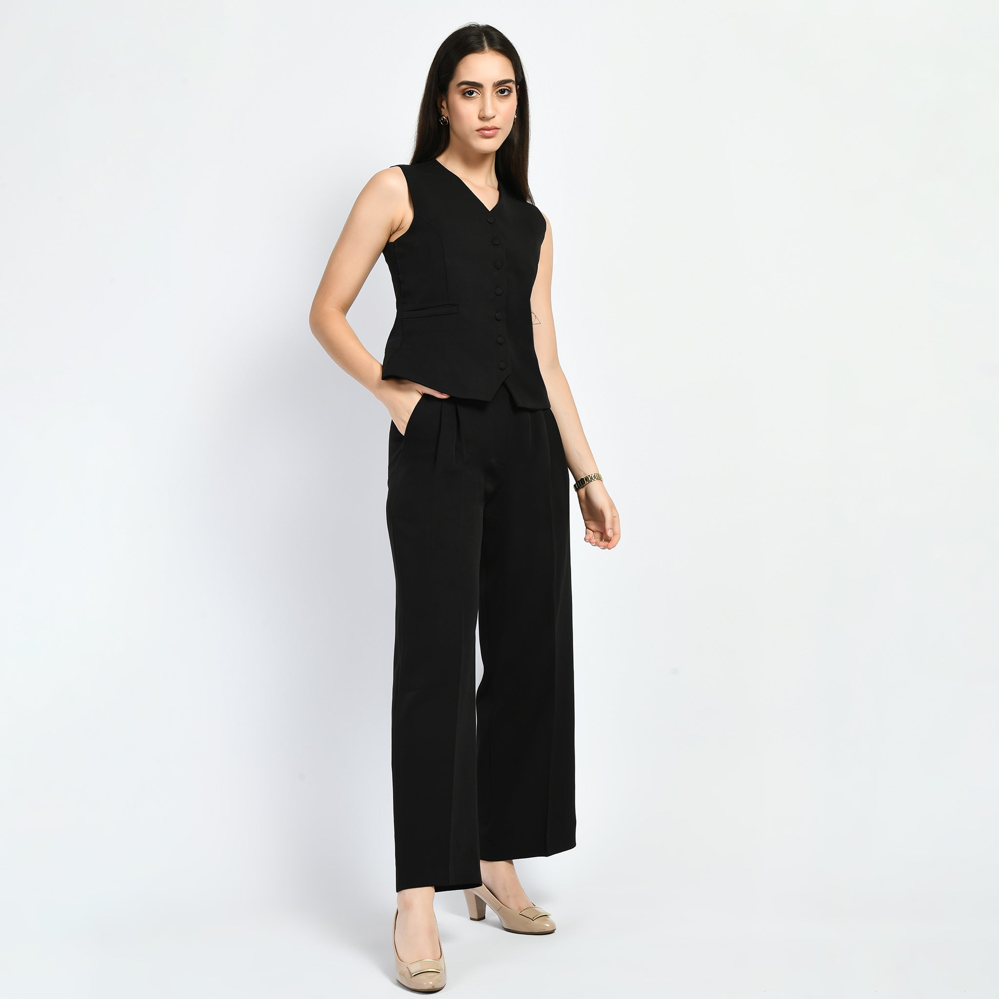 Exude Elusiveness Solid Wide Leg Trousers With Waist-Coat Top Co-ord (Black)
