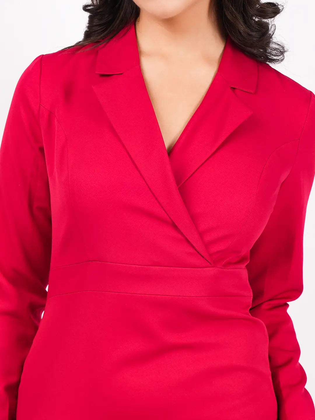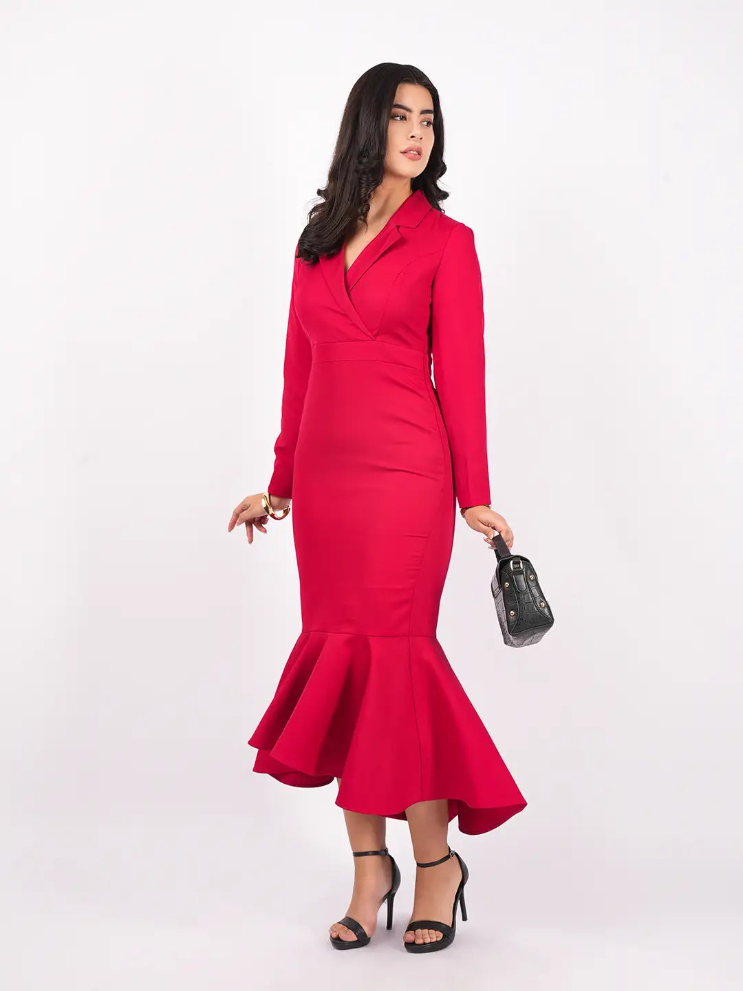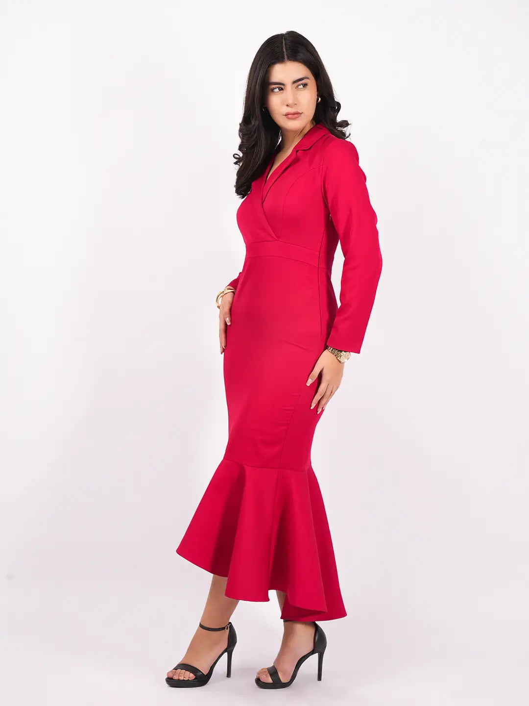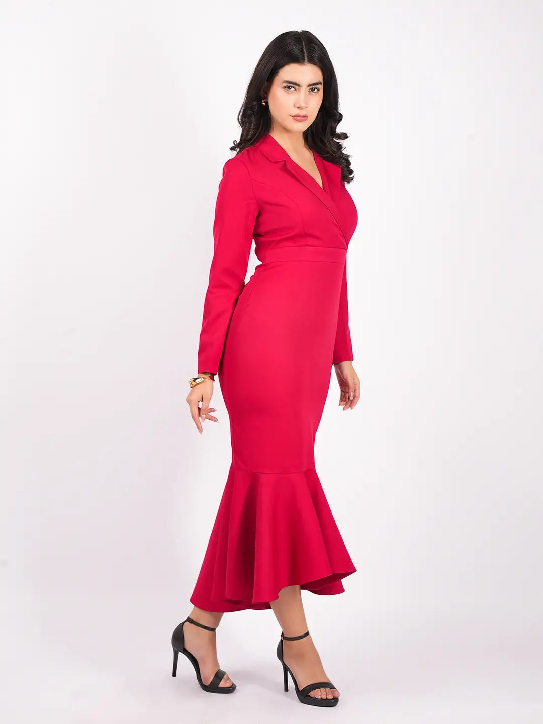 Cross-front lapel neckline, long sleeves, fitted body with flared midi-length trumpet hem.