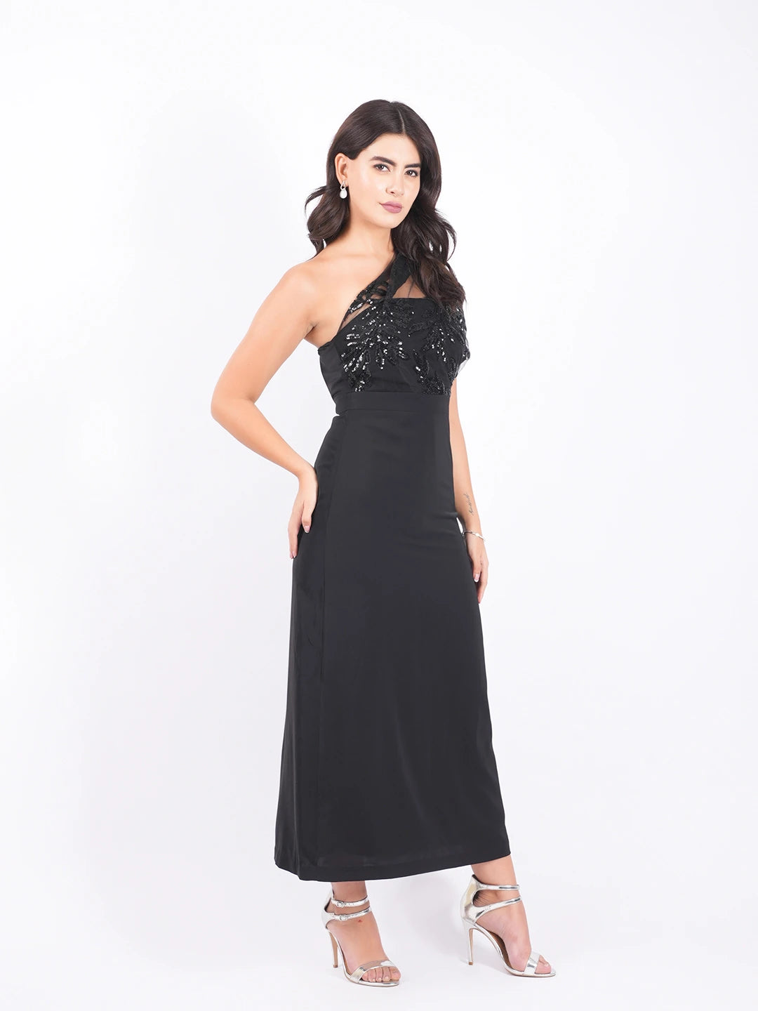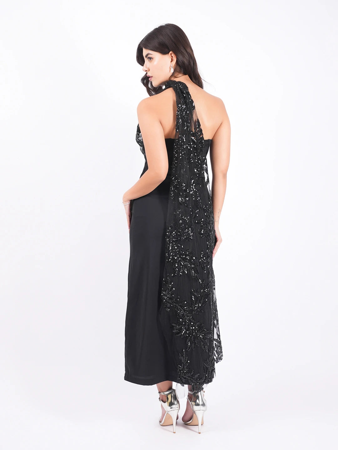 High halter neckline with soft net drape Intricate sequin leaf embroidery on bodice Concealed back zipper for a seamless fit Ideal for formal evenings, receptions, and festive events