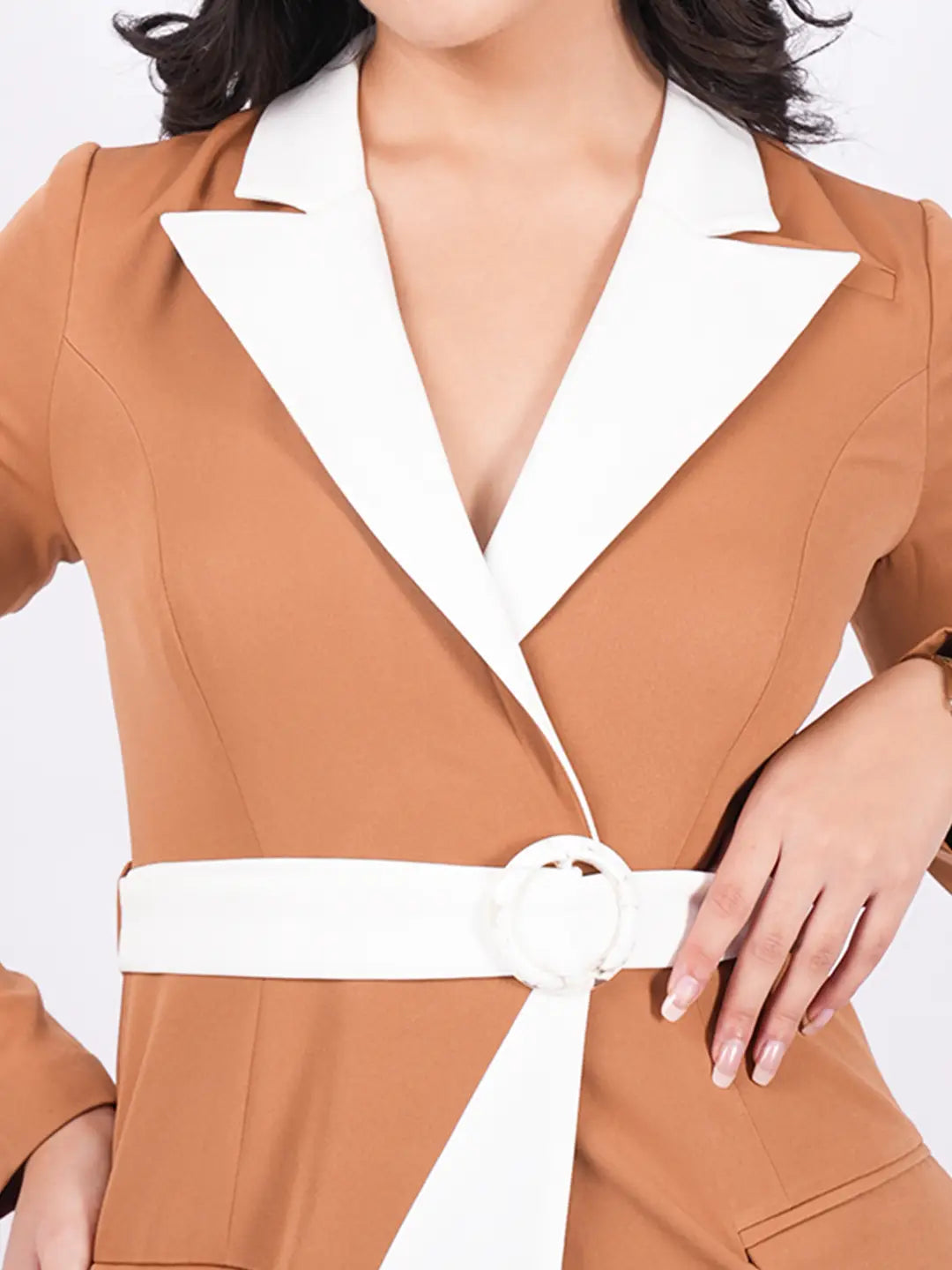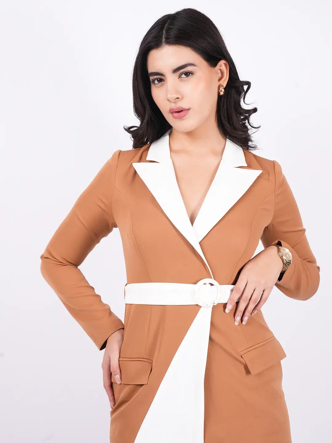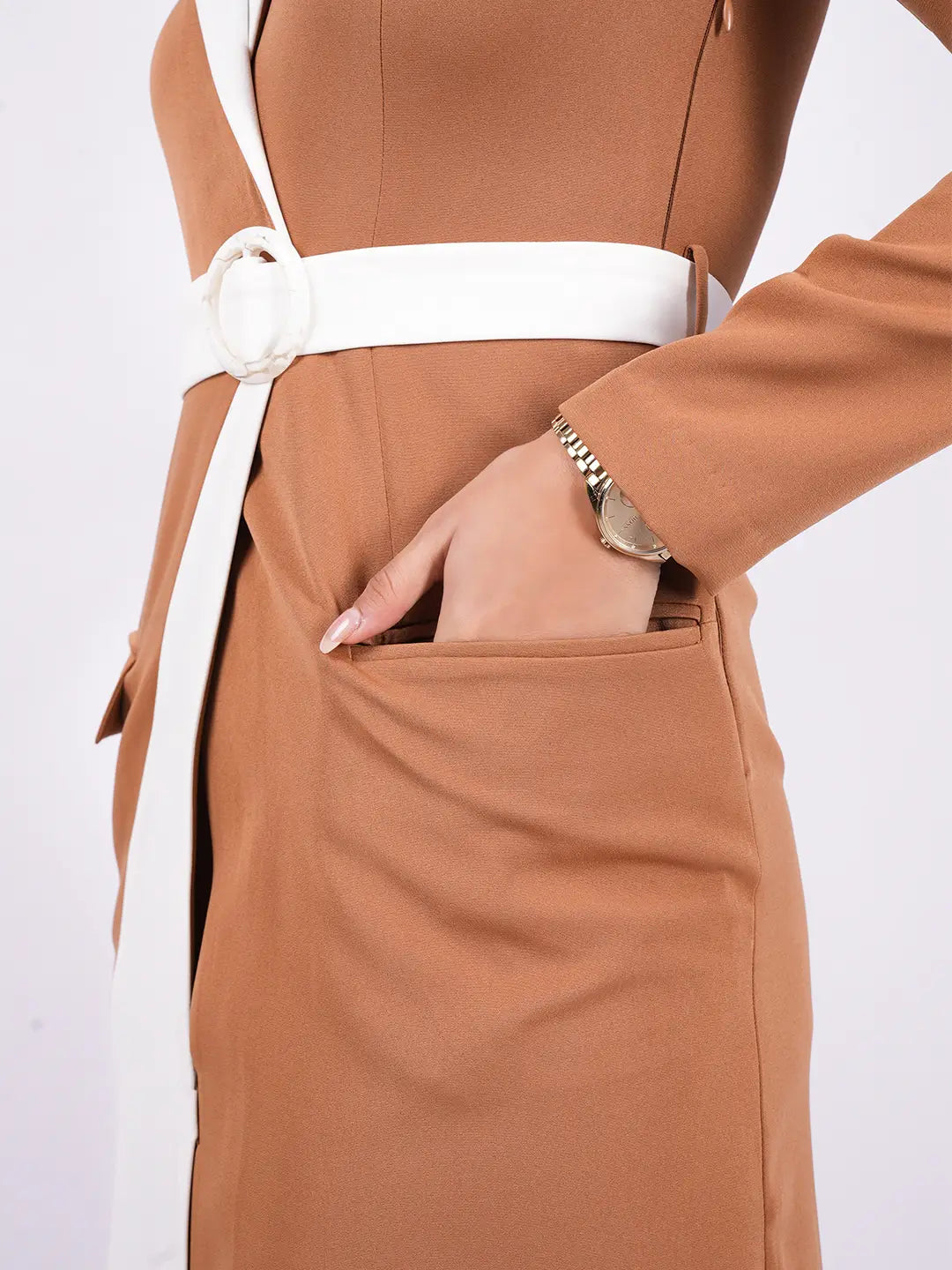 Tailored mocha silhouette with an ivory contrast panel, full lining for warmth, chic buckle belt, and flap pockets provide everyday polish and comfort.