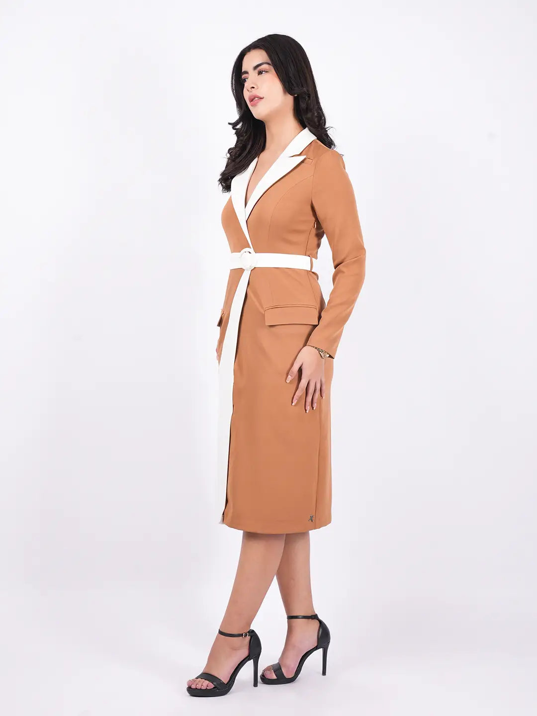 Tailored mocha silhouette with an ivory contrast panel, full lining for warmth, chic buckle belt, and flap pockets provide everyday polish and comfort.
