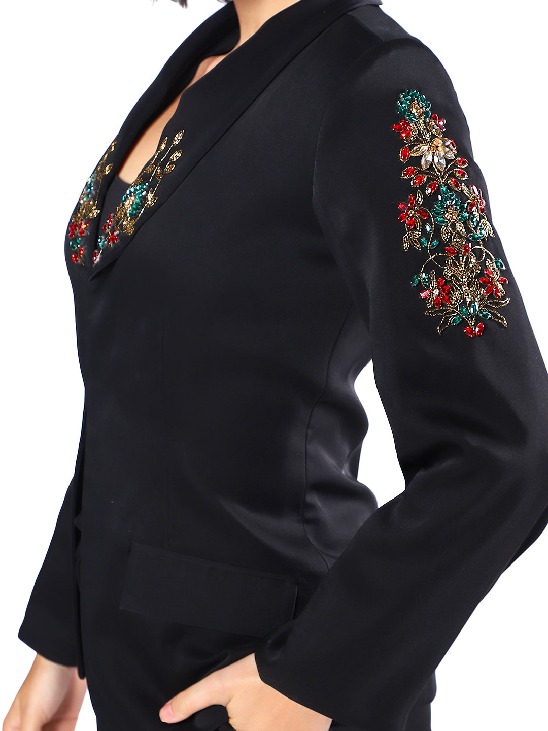 This tailored black set stands out with artful floral embroidery on the blazer’s shoulders and front seams, combining traditional elegance with contemporary sophistication. The ensemble includes matching straight-leg trousers, promising a flattering, confident silhouette for office, events, or chic evenings out. Pair it with bold heels for a high-impact, polished look every time.