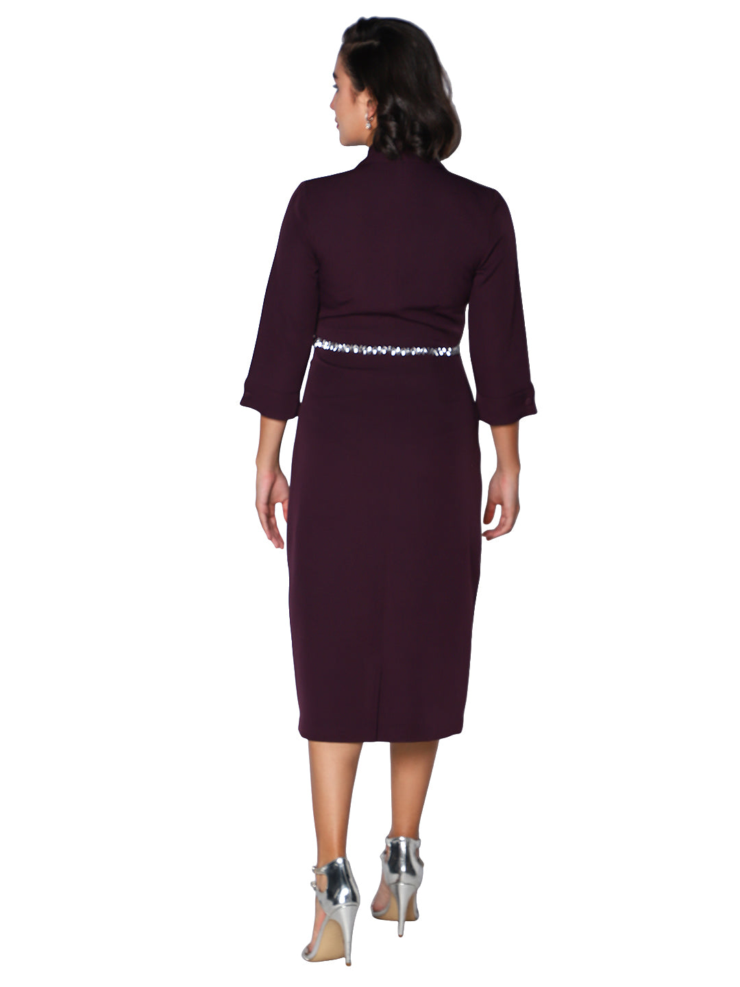 The dress is adorned with a delicate crystal-embellished waistline for a touch of glamour. The rich plum hue adds depth and elegance, while the 3/4 sleeves offer a graceful silhouette suitable for formal dinners, evening events, and festive occasions.