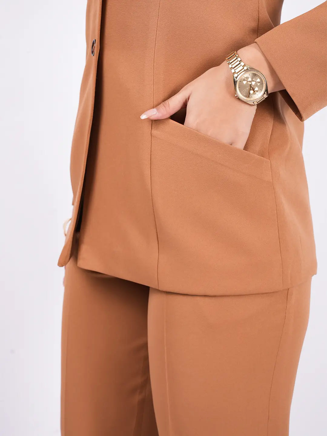 Statement shoulder panel, classic notched lapel, and deep pockets for impact and utility in every detail.