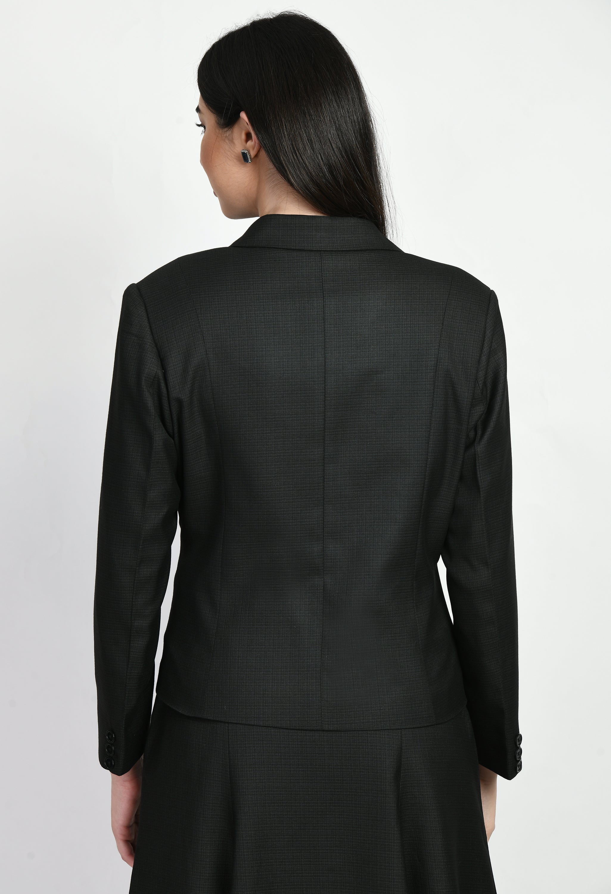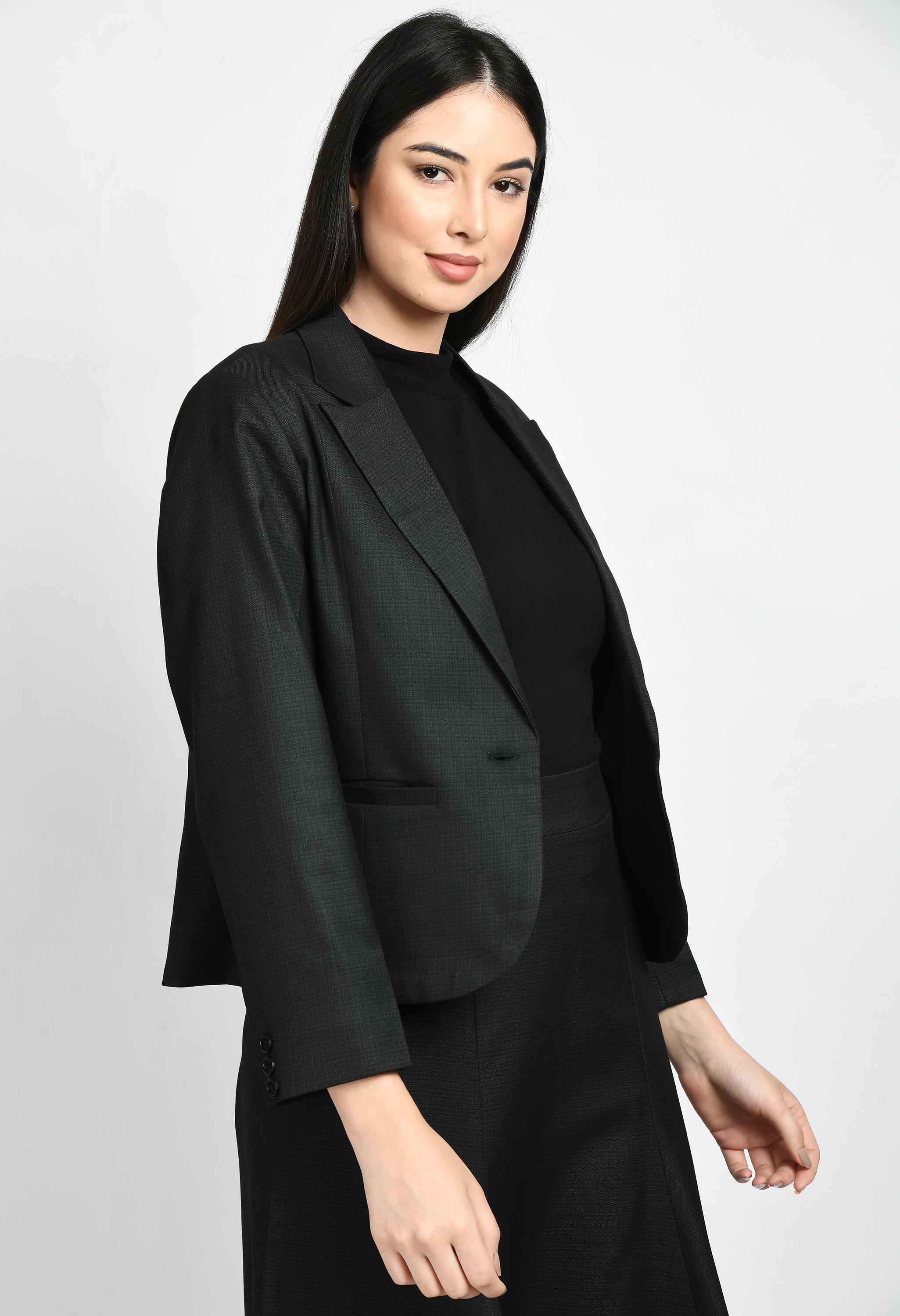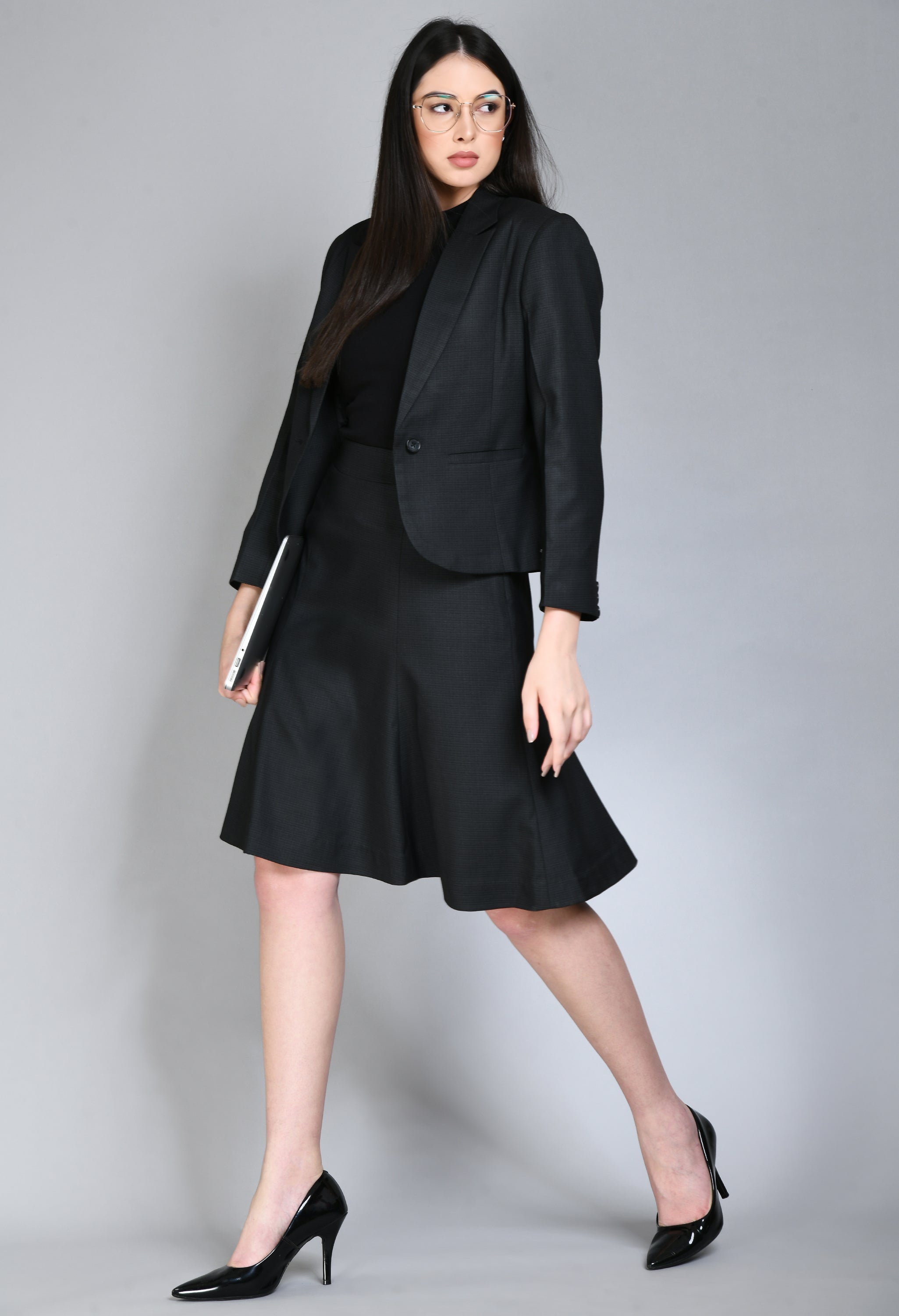 A unique a-line skirt paired with a formal short blazer. The suit set is made from the finest and softest suiting fabric with natural stretch which has a self checked design in black. The colour may vary slightly according to device settings.