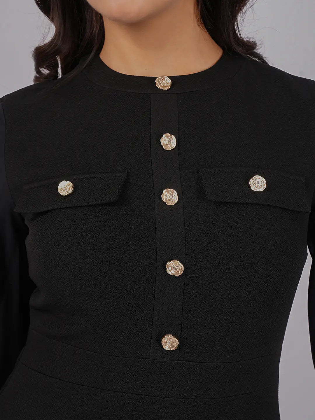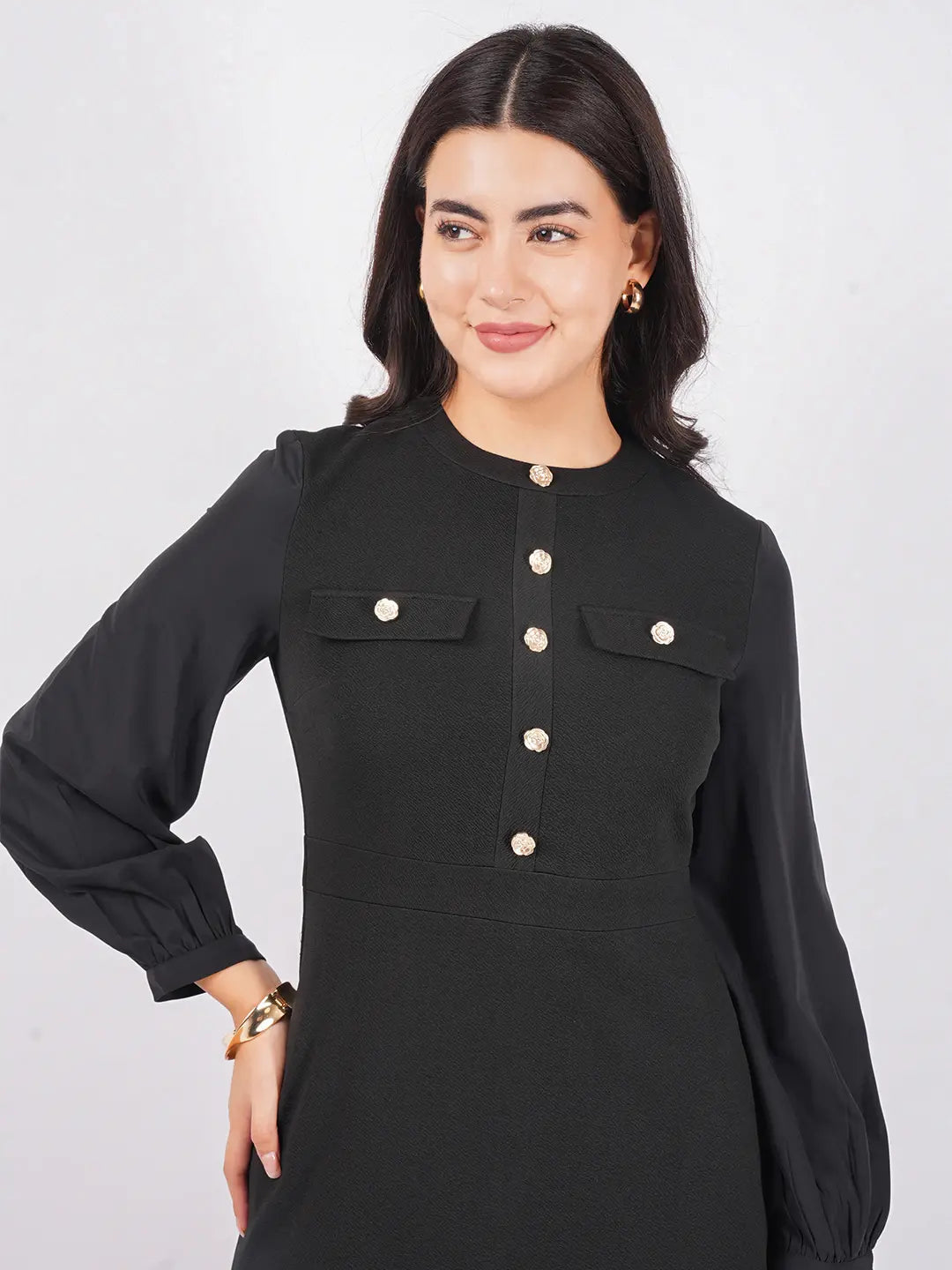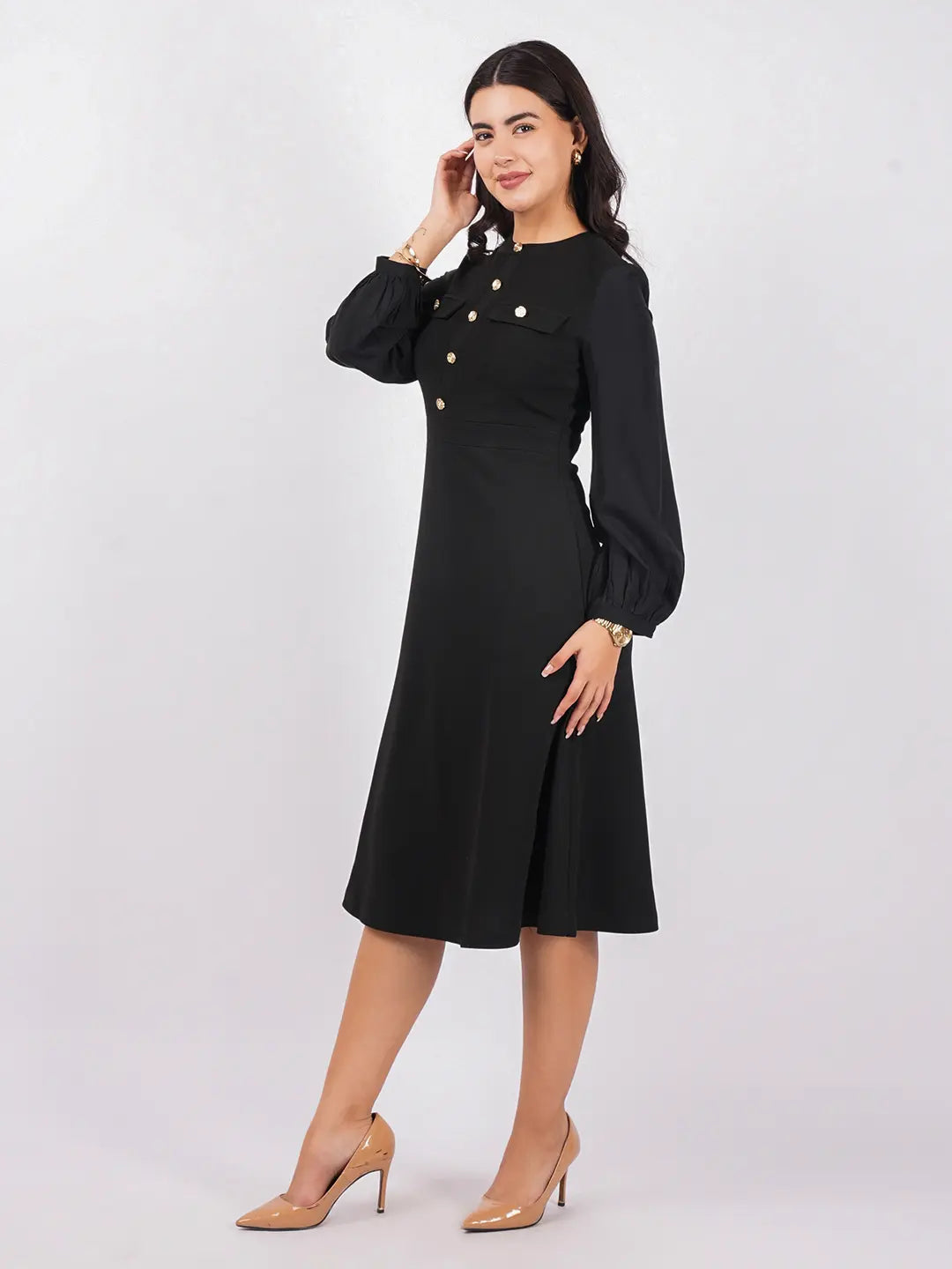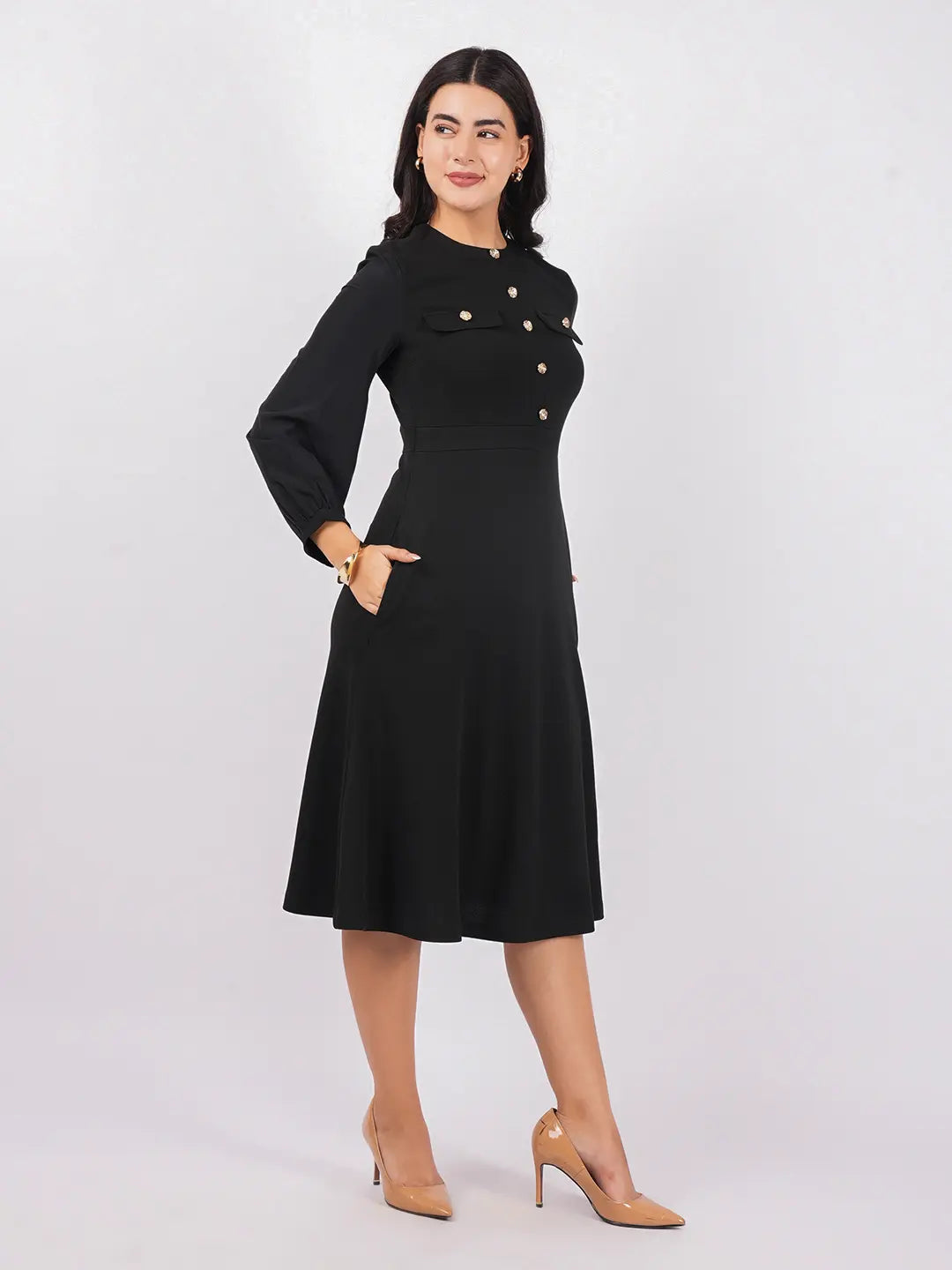 Full button bodice, statement front pockets, tailored cuffed sleeves, and clean midi hem with side seam pockets.