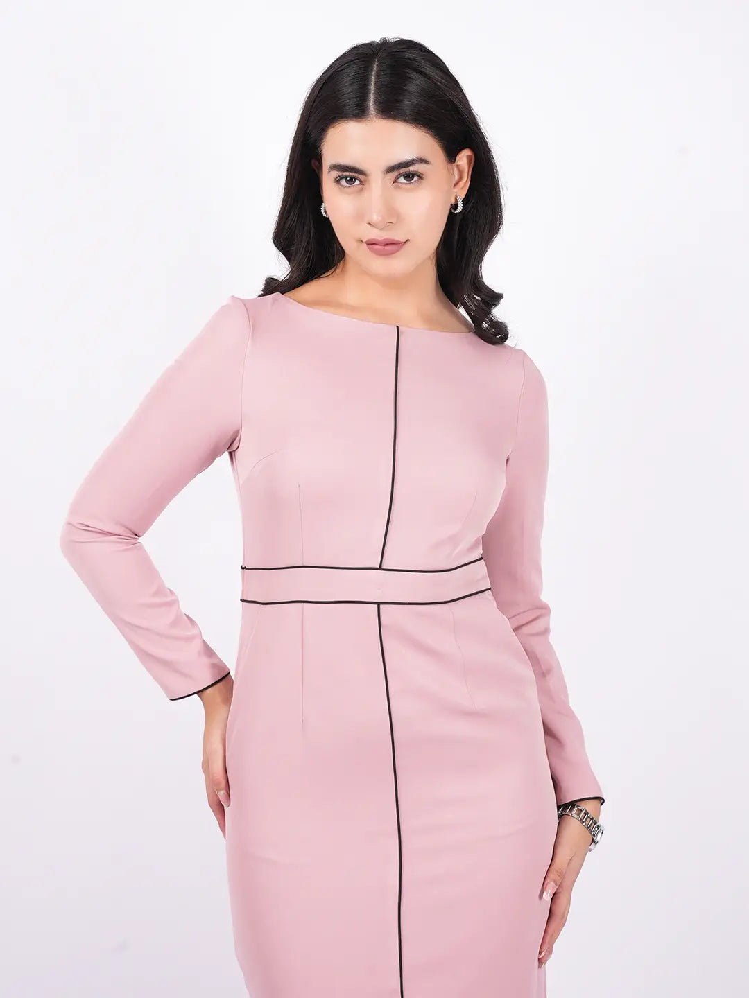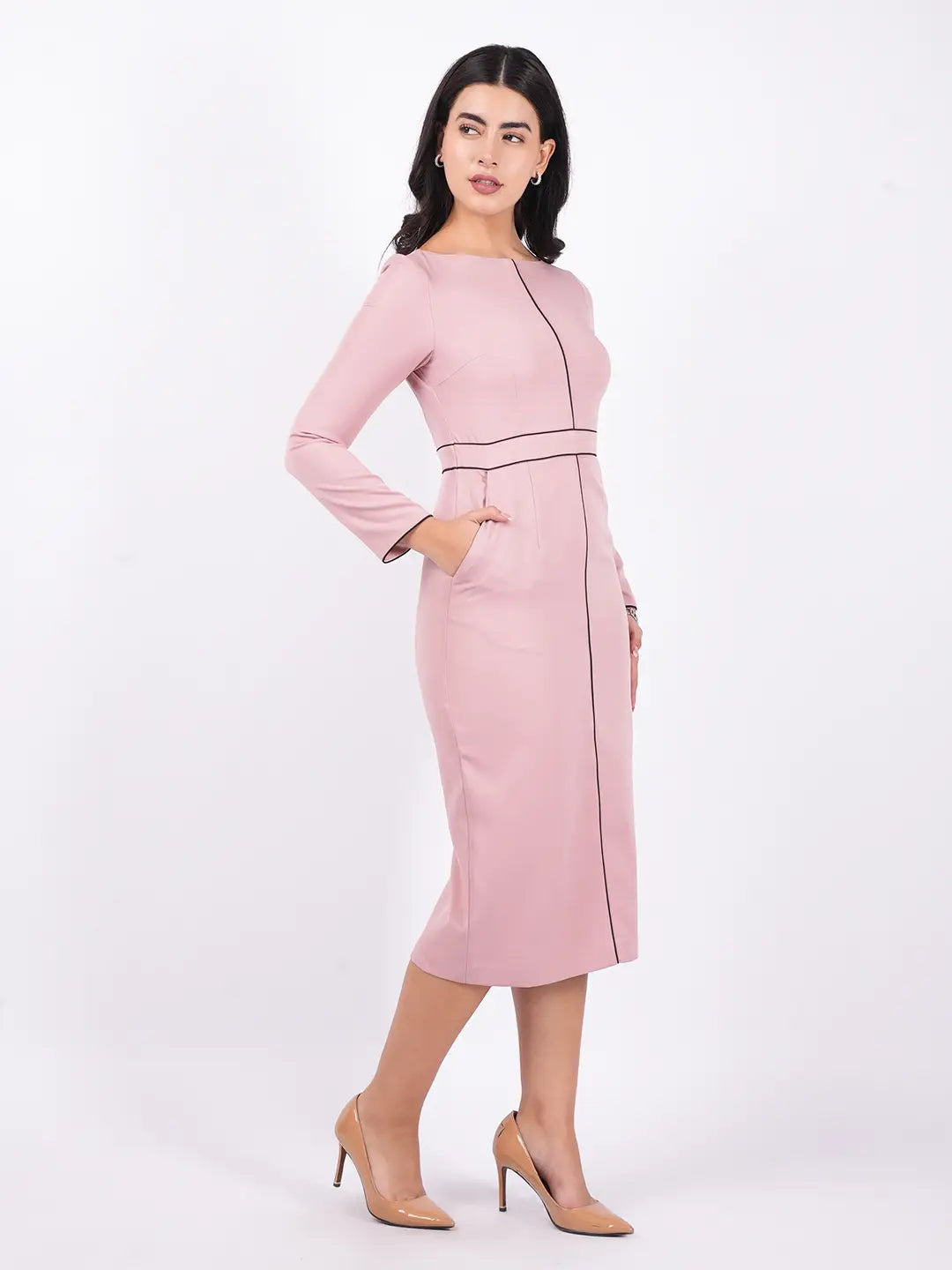 Signature piped seams, fitted long sleeves, subtle waist focus, and a poised midi length for modern polish.