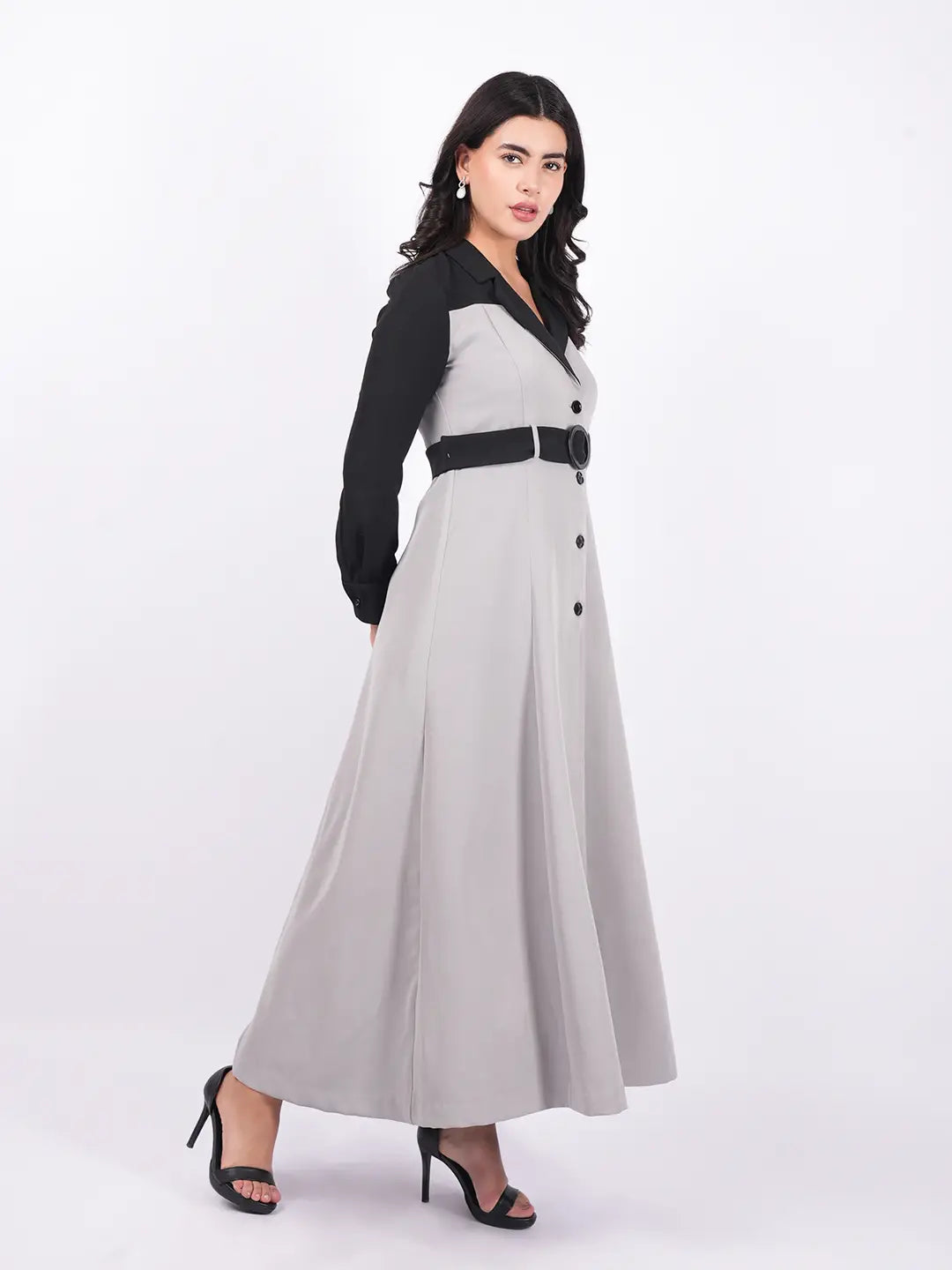 Runway-worthy collar and lapels, trench buttons, cinched waist, and a fluid, full skirt.