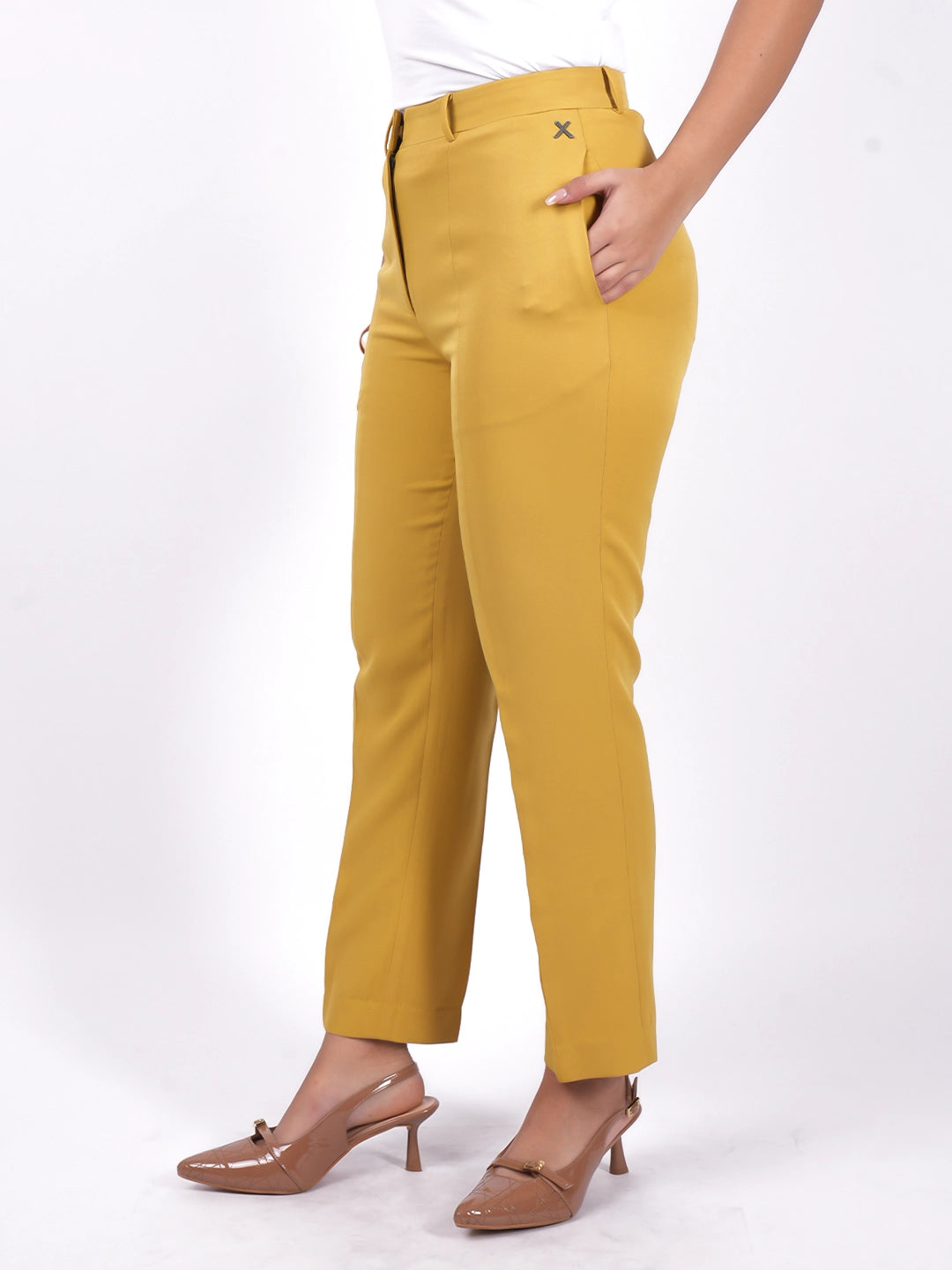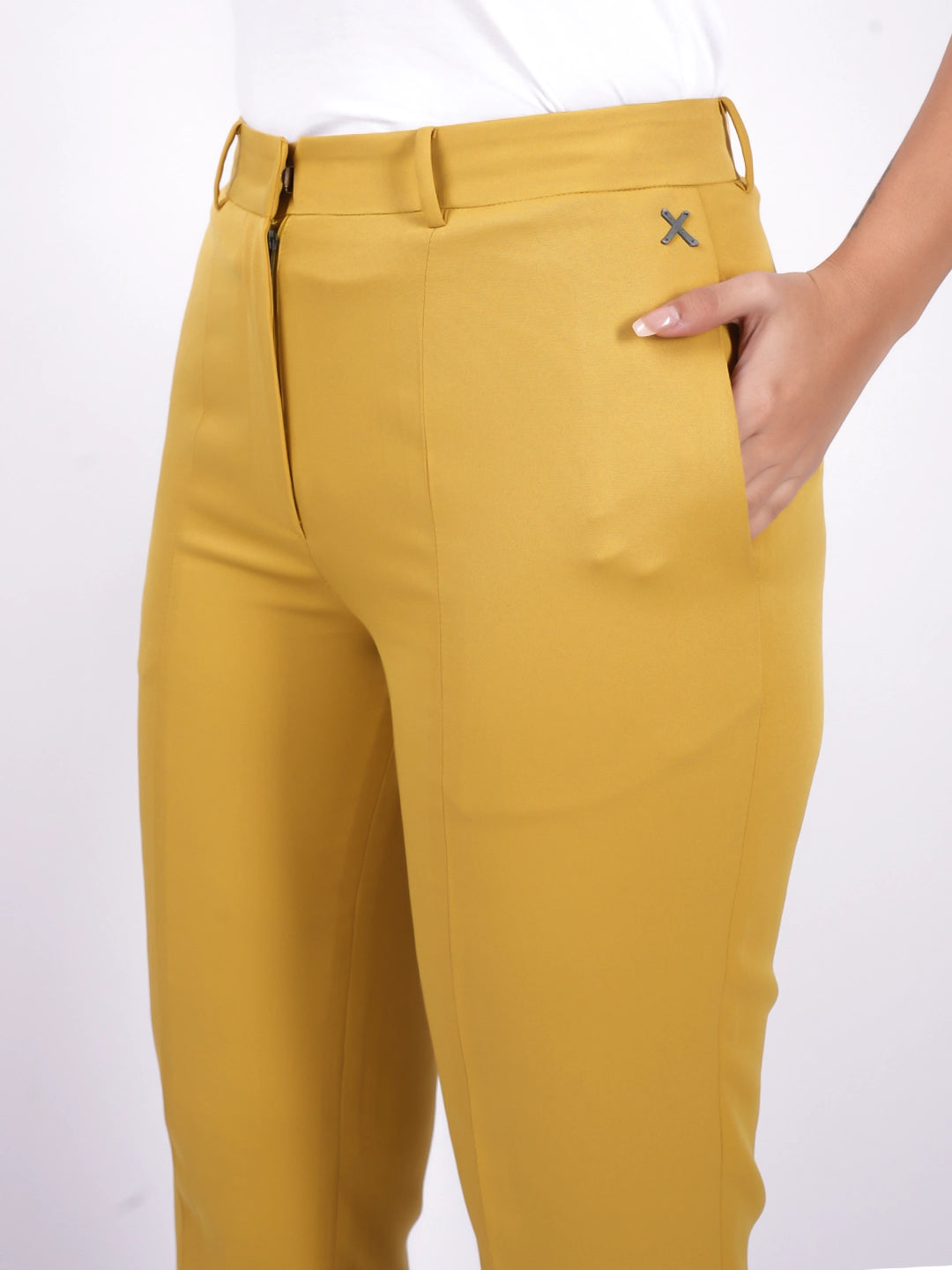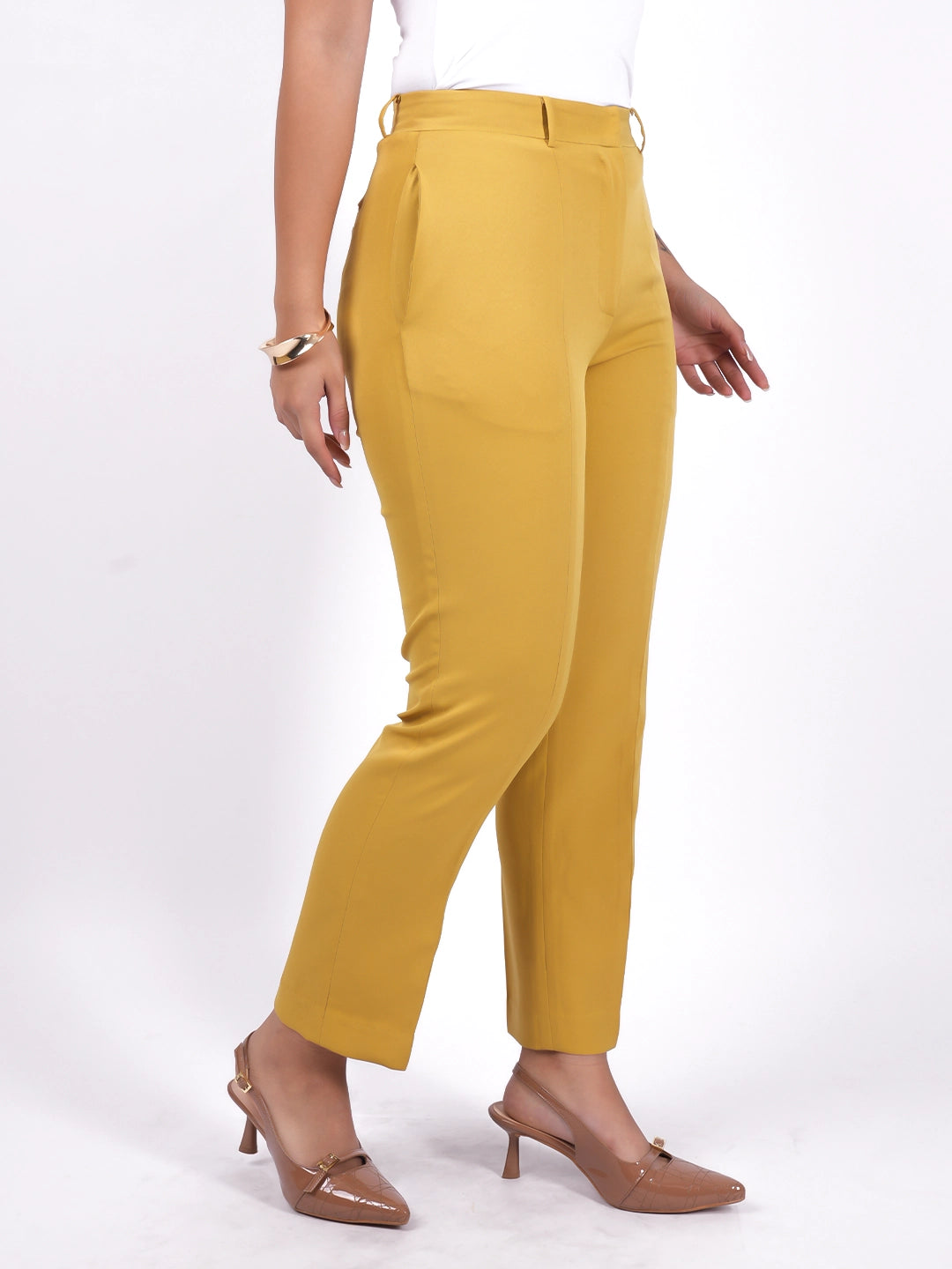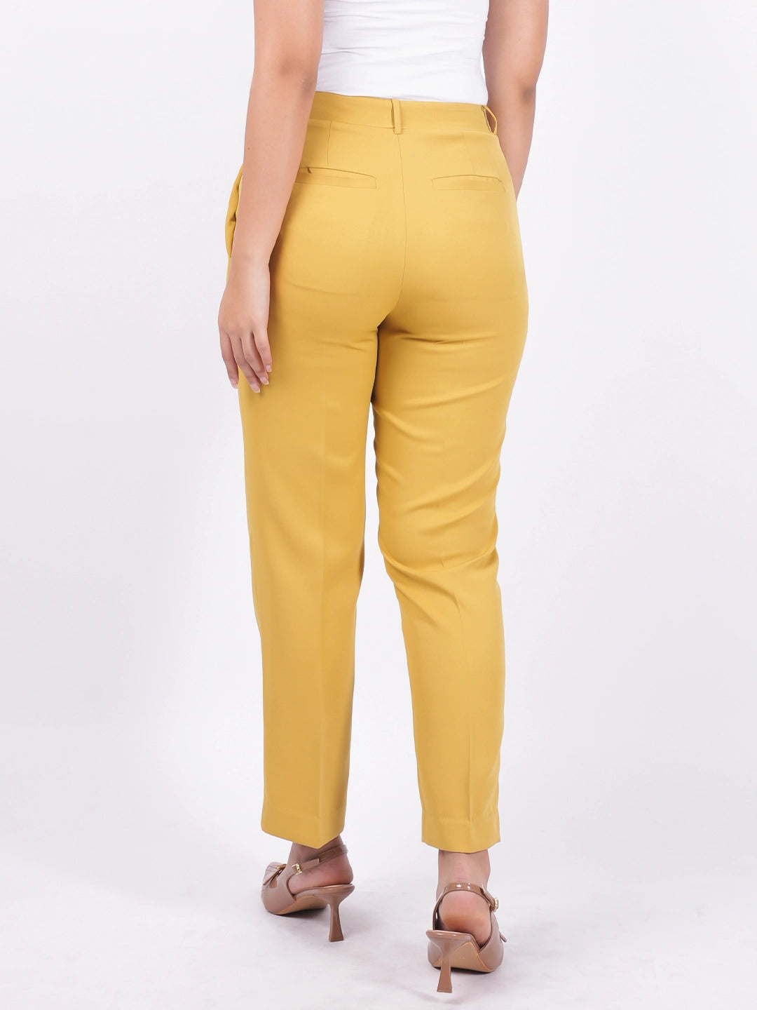 High waist, flat front, pressed creases, streamlined leg with a neat ankle finish, and subtle pockets.