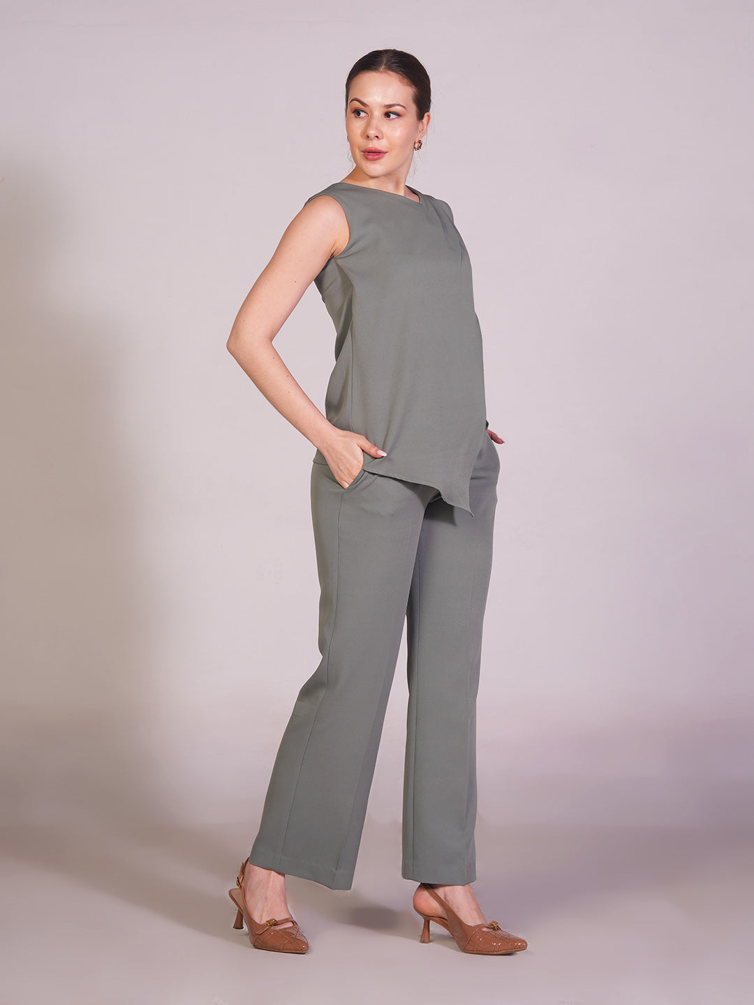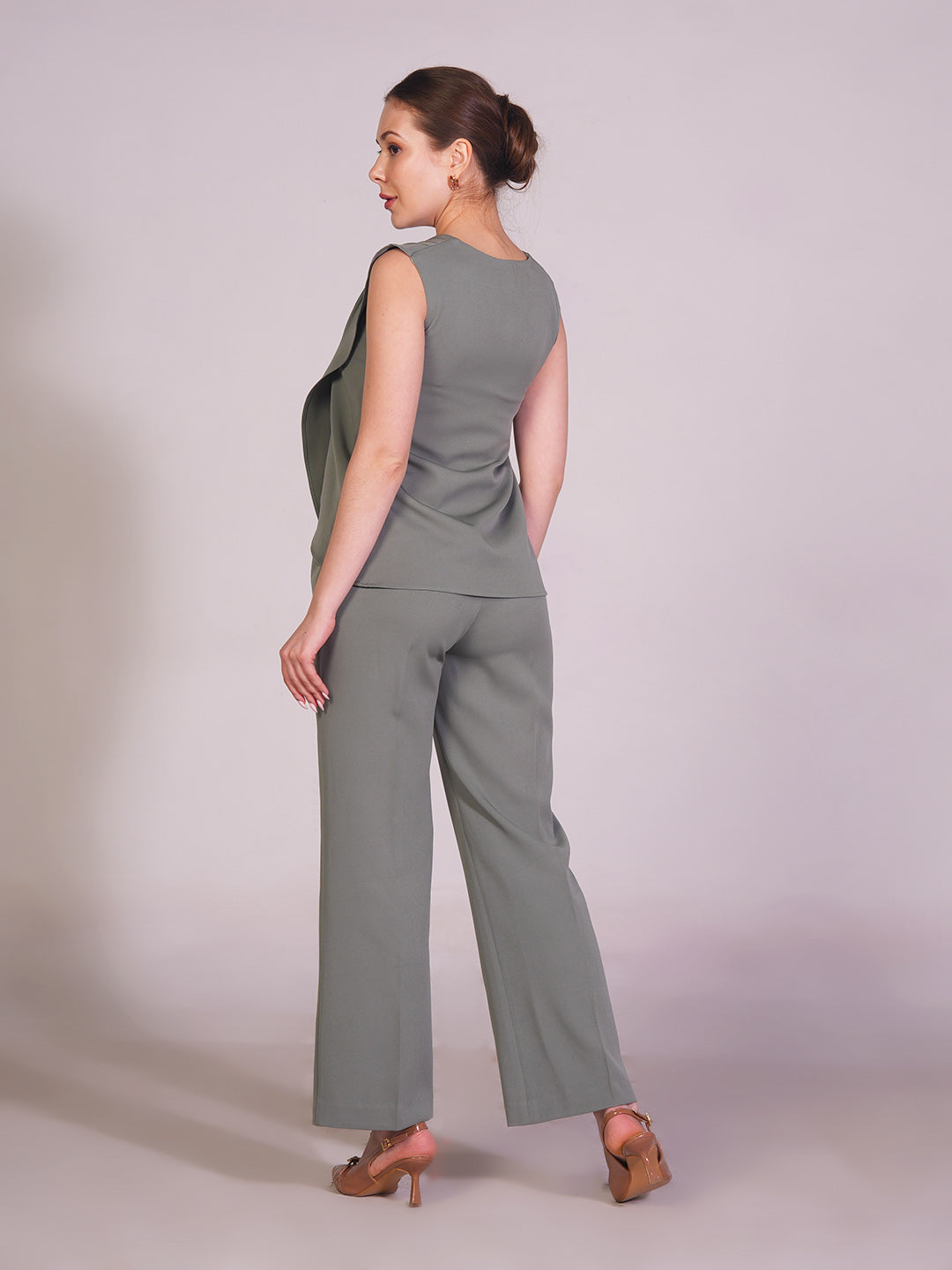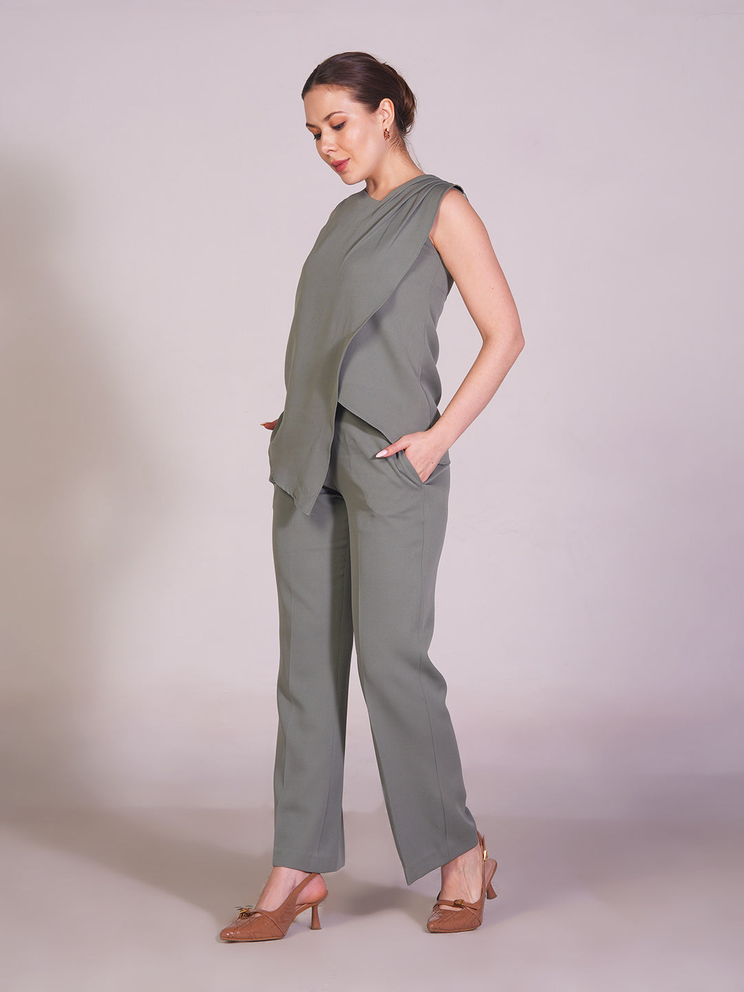 Step into effortless sophistication with the Exude Unbreakable Rivera Overlay Co-ord Set, featuring a sleeveless linen overlay top and tailored straight-fit trousers in a refreshing pista green shade. The soft linen top drapes gracefully, adding fluidity and elegance, while its overlay detail enhances movement with subtle charm. Paired with structured linen trousers, the set strikes a perfect balance between refined polish and relaxed ease. Ideal for both daytime elegance and evening poise, this versatile ensemble embodies confidence, comfort, and modern grace.