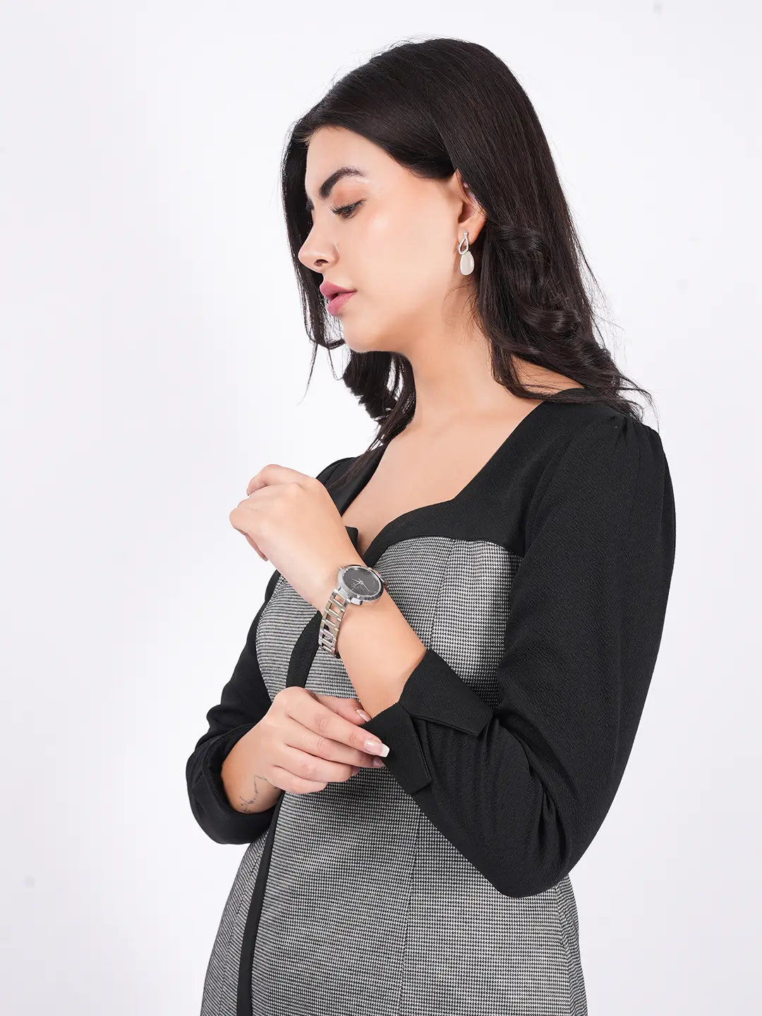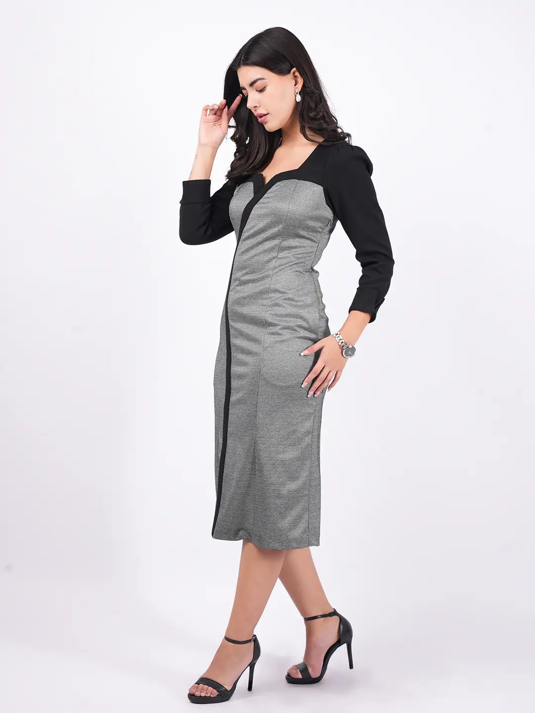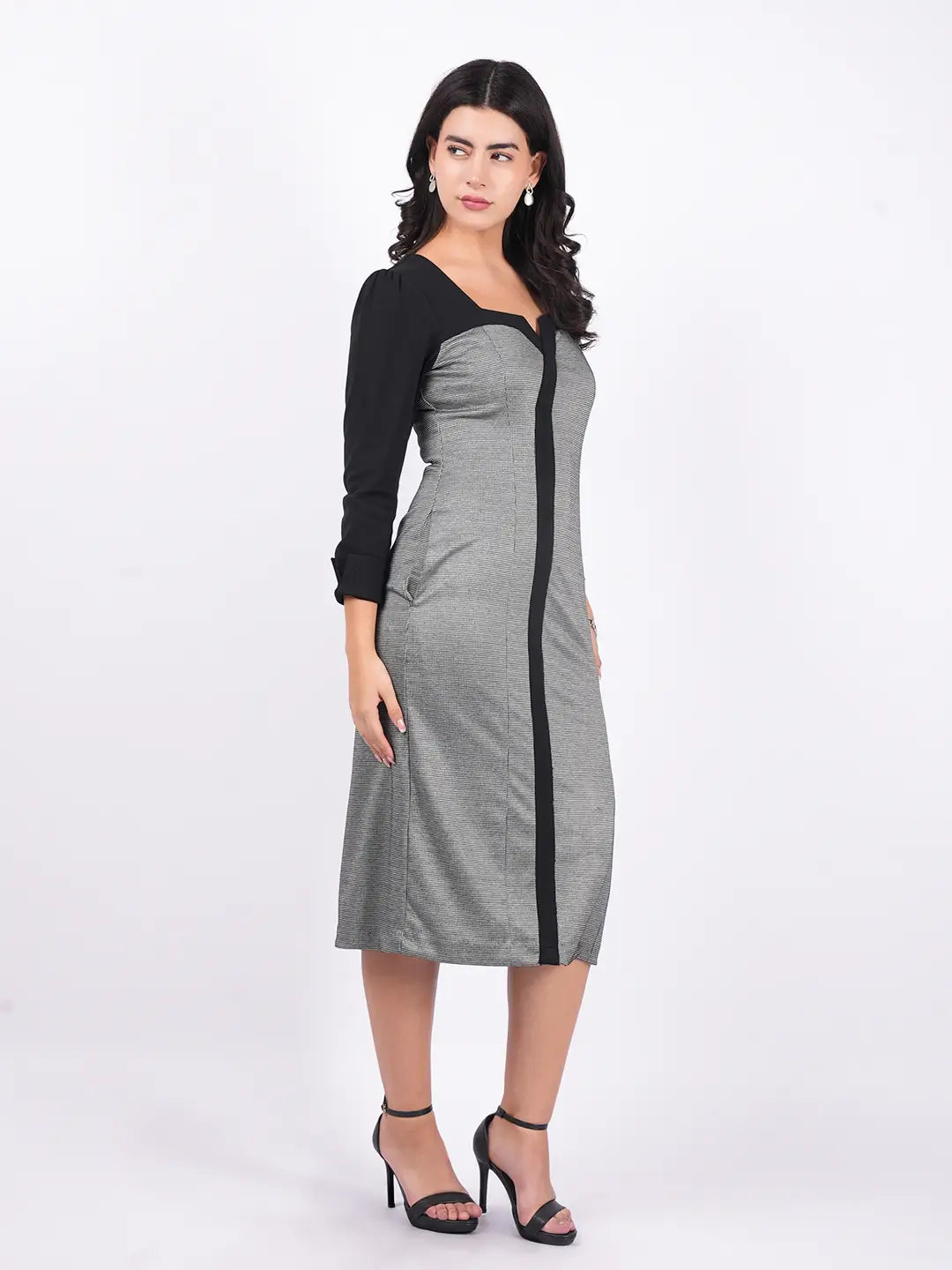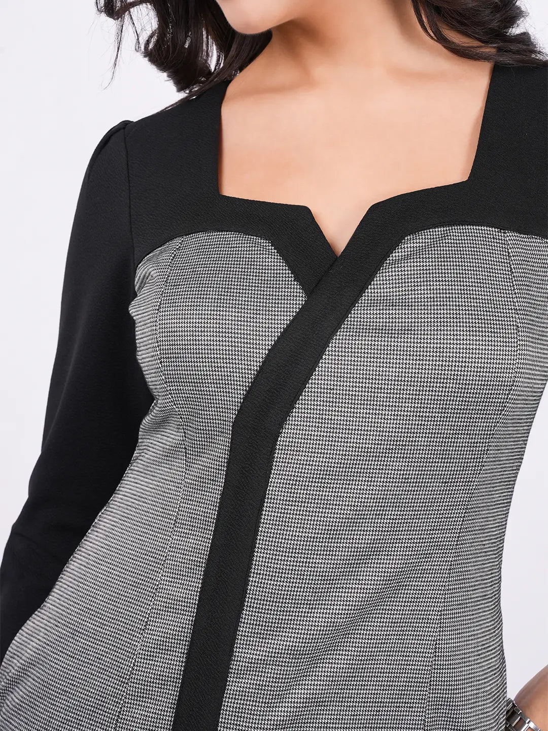 Contoured contrast panels, unique notch neckline, and a fully lined interior make this dress a smart choice for work, presentations, or dinner outings.