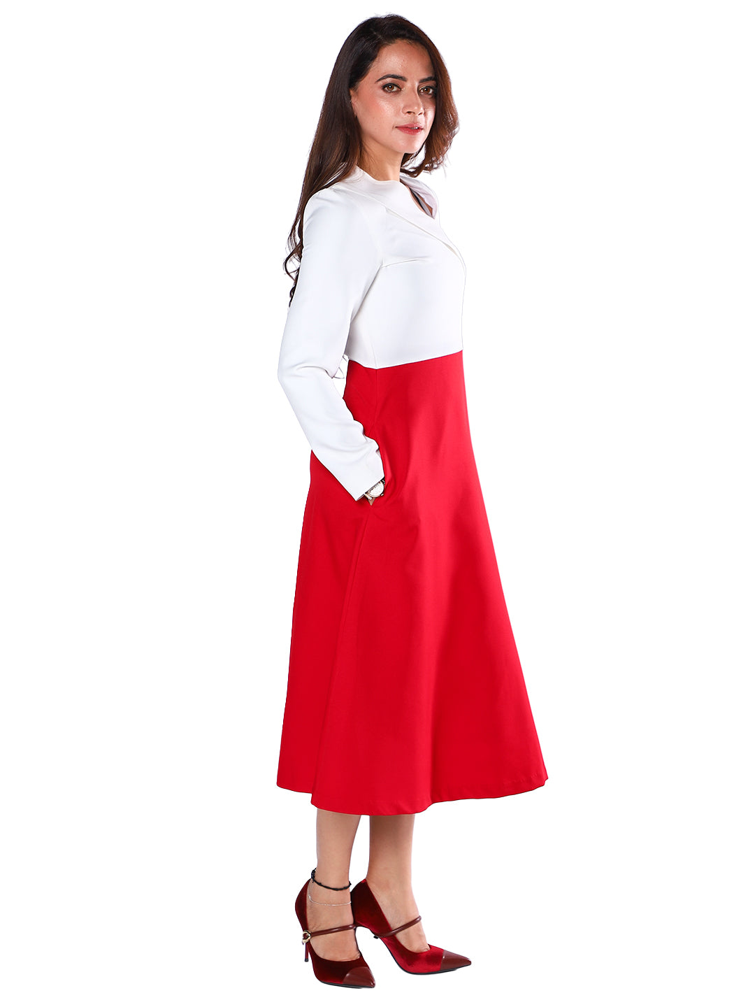 The structured silhouette and color-block design make it perfect for festive gatherings, evening outings, or office occasions. Pair it with classic pumps and minimal jewelry for a graceful, confident look.